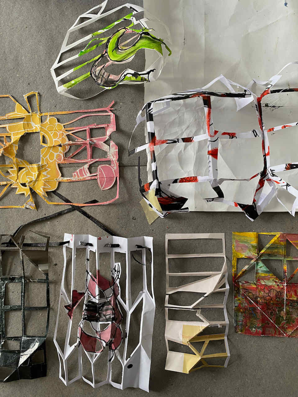 es wurden Bühnen gebaut und Bühnenformen erkundet, mit den einfachsten Materialien: Zeichnungen, Drucken, Restepapier, Karton.