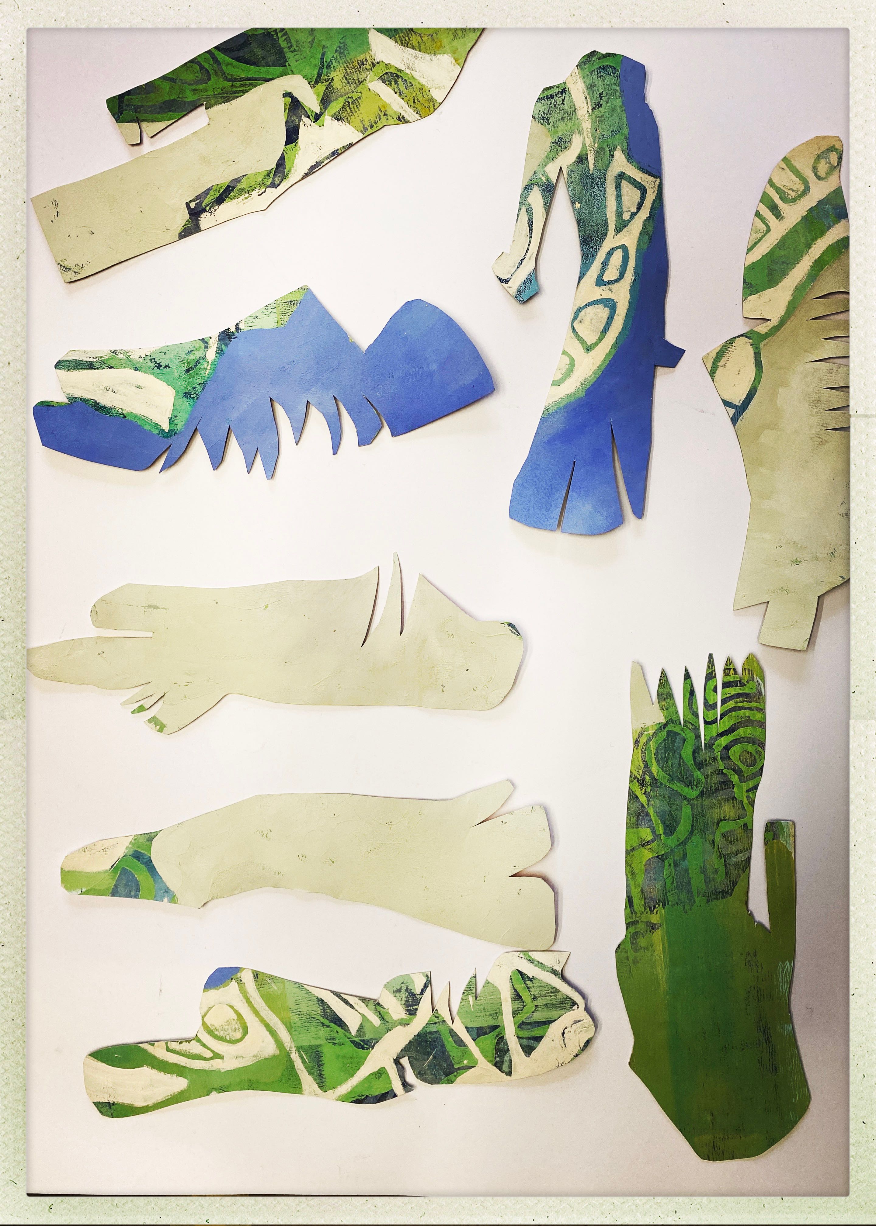 Oder die Methode Zufall: Zwickelformen werden ausgeschnitten, hochgeworfen und das entstandene Muster wird fotografiert, und es werden Verbindungen hergestellt, welche auch immer. Und das Ganze wird weiter verarbeitet.