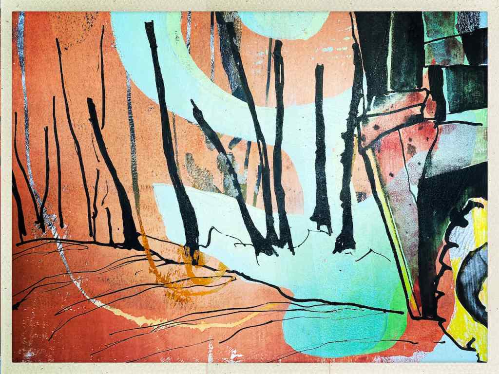 Diesmal hat Jürgen sich im Atelier umgeschaut, einiges auf den Tisch gelegt, sich hingesetzt und einfach mal geklebt und gedruckt. Erst tun, dann denken! Und danach dann hat er seinem Bild einen Titel gegeben: “ … wie die Linien das Blatt durchsägen.“ Normalerweise funktioniert das bei ihm umgekehrt: erst die Ergänzung des Satzes, dann das Bild.