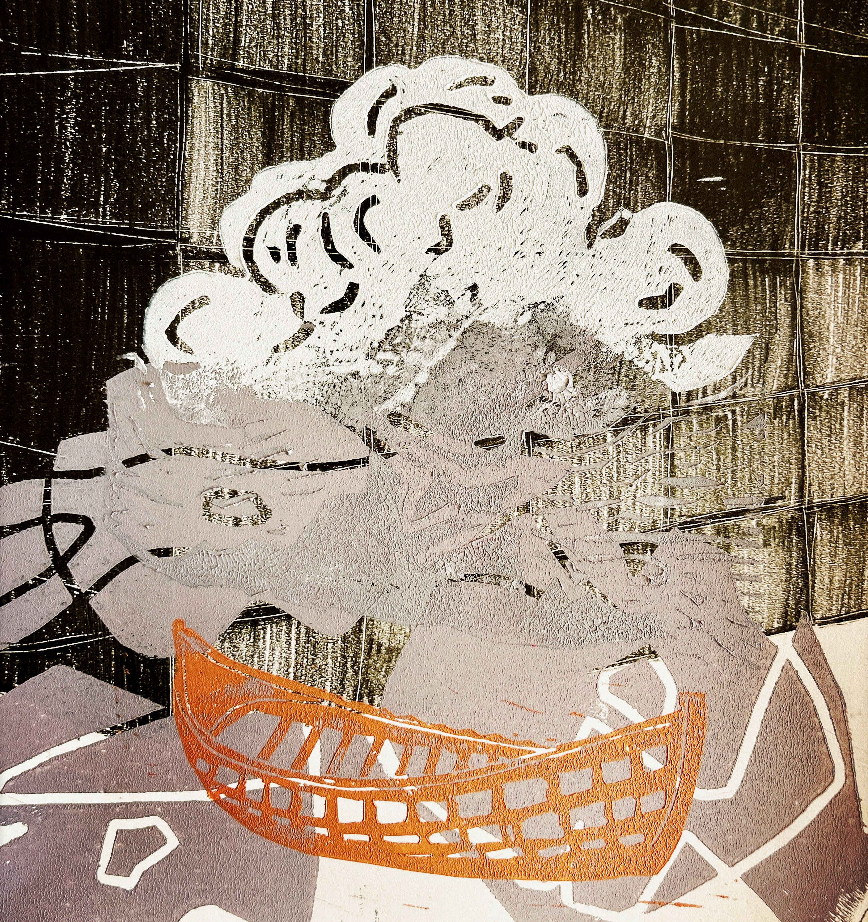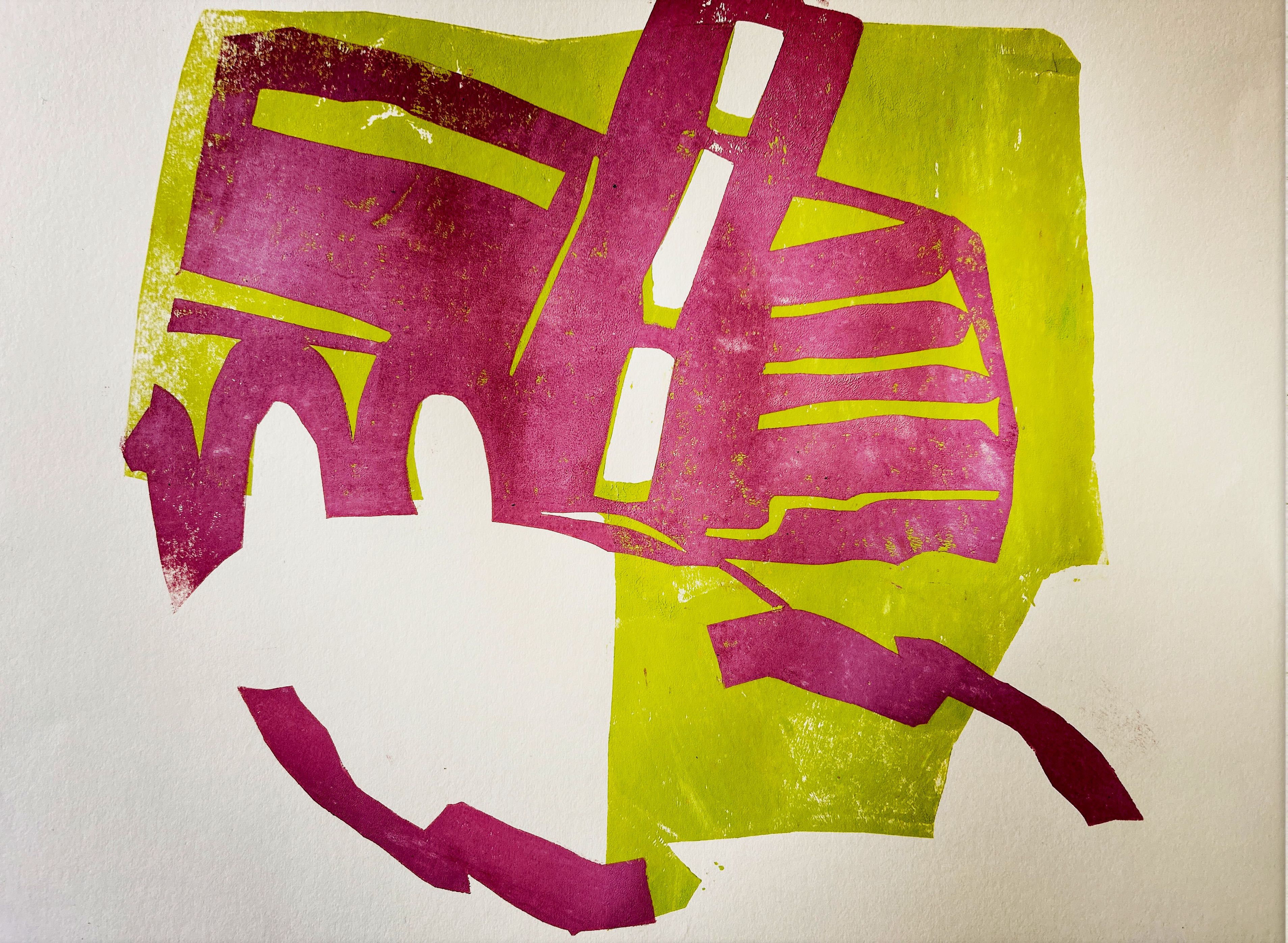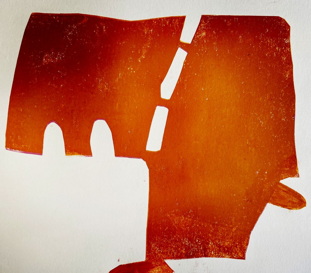 Jürgen druckt fast immer nach dem Prinzip der verlorenen Platte. Und wenn dann der Druckvorgang beendet ist, noch etwas Farbe über geblieben ist, geht er zügig zu seinem Stapel von Resetpapieren, wählt einige Papiere fast schon zufällig aus und druckt die restliche Farbe mit der letzten Platte auf dieses Papiere. So auch in diesem Fall als es um das Thema „Zukunft“ ging.