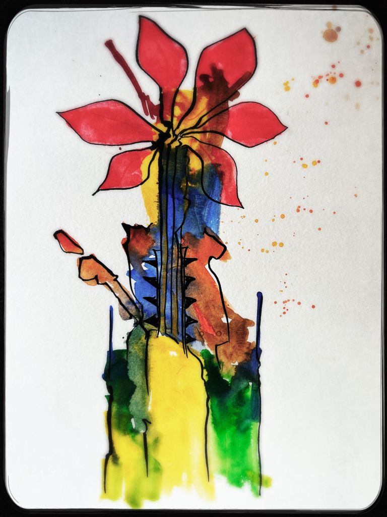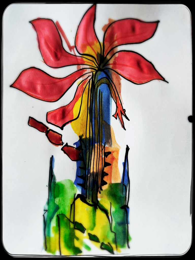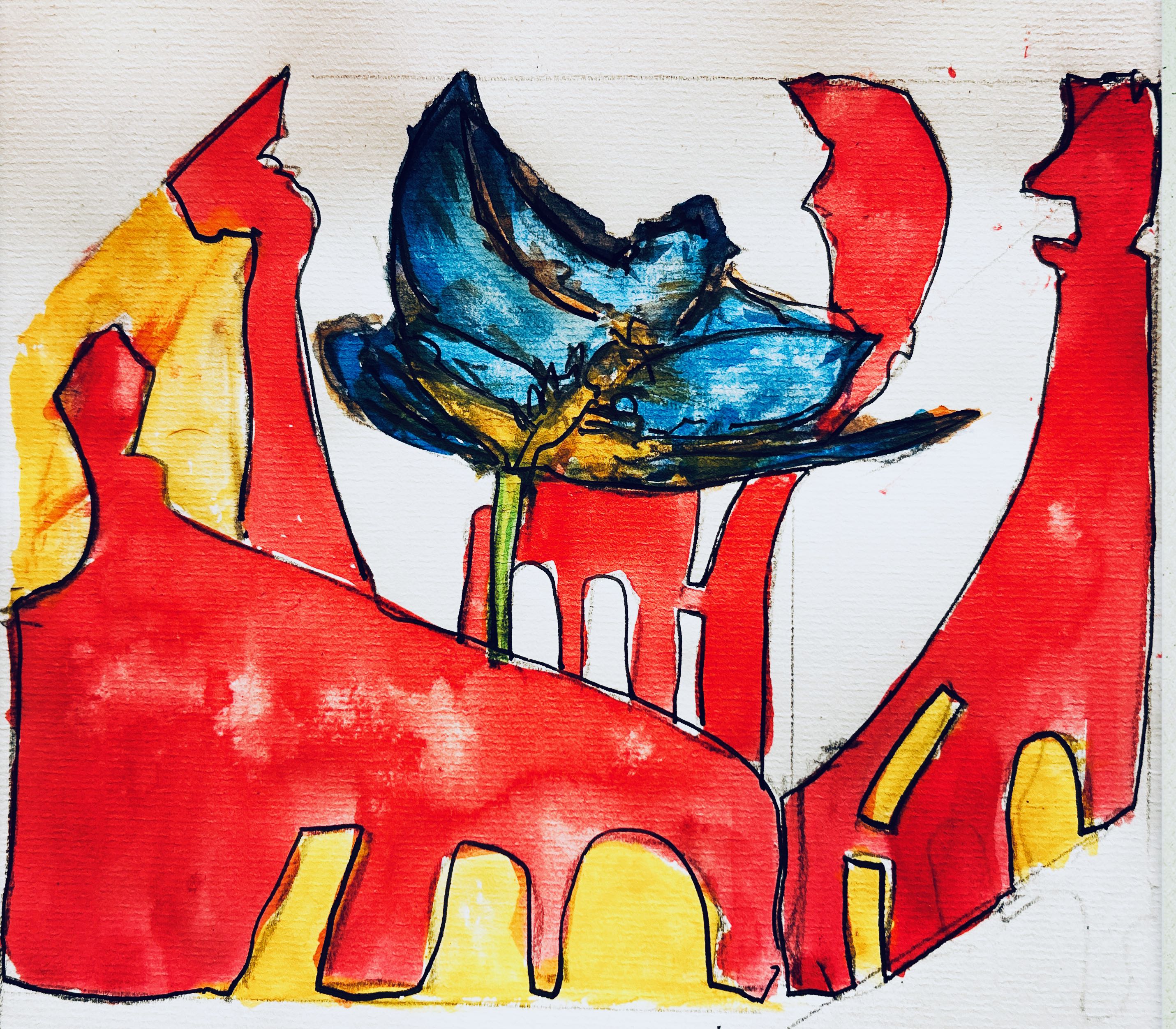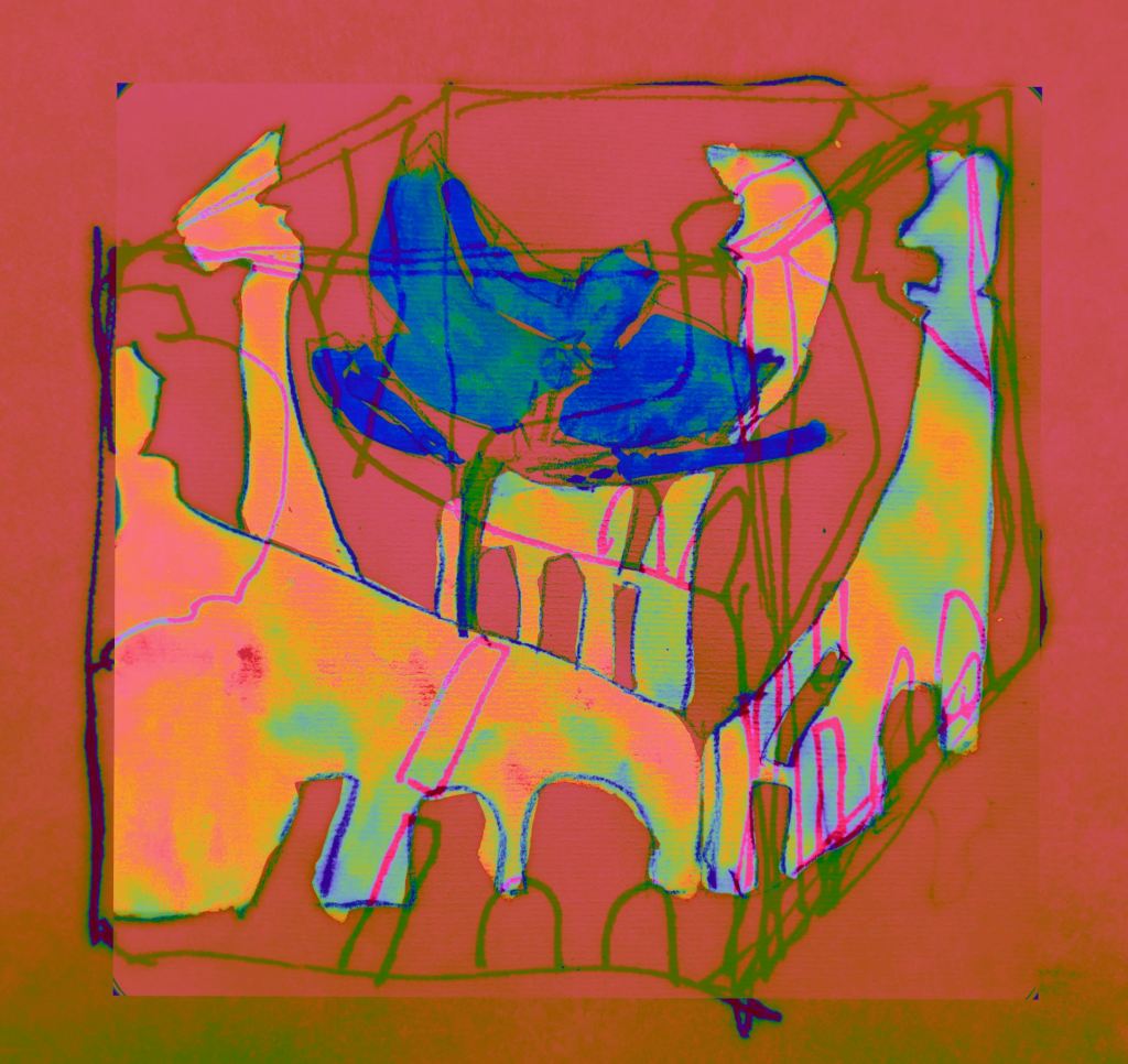 Und der dritte Durchlauf zum Thema startet nun mit dem Foto des letzten Papierobjektes, s. oben, und einigen daraus resultierenden hingeworfenen Digital- oder Aquarell- Skizzen: