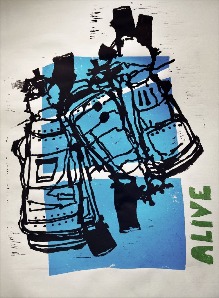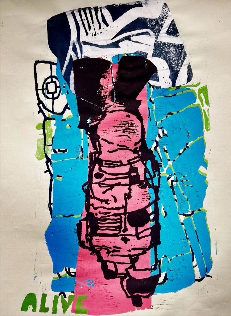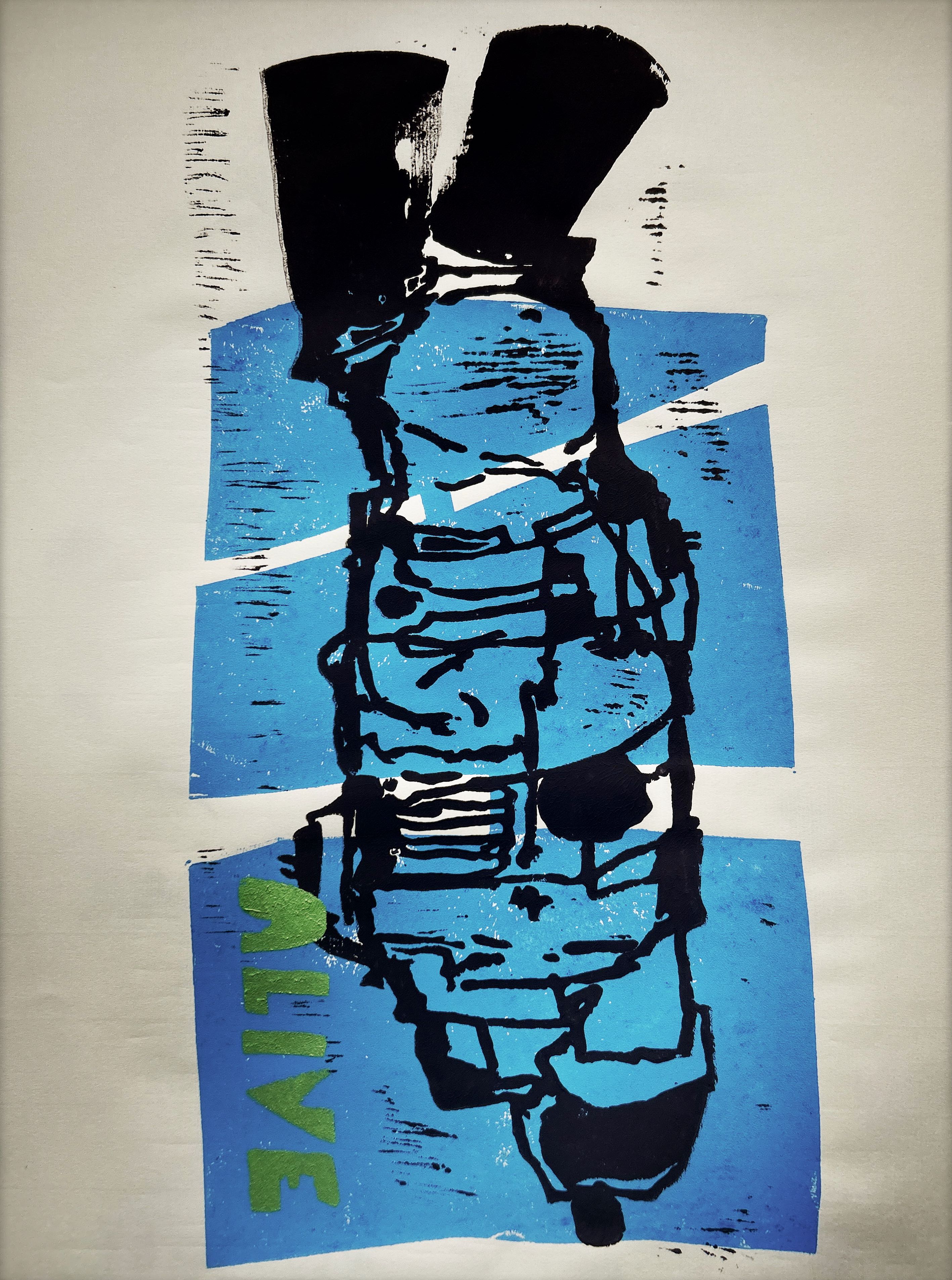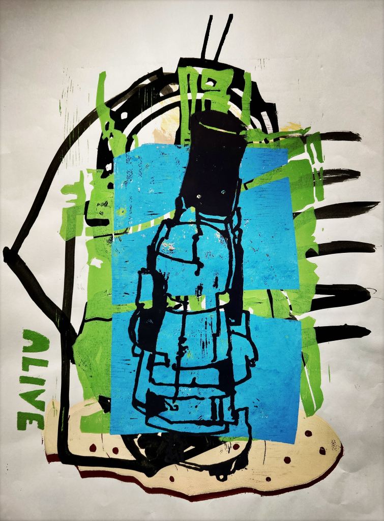 Ich durfte wieder einen Blick in sein digitales Notizbuch werfen. Da steht, skizzenhaft:“Energien treiben uns an, in allem, mit der Krise ist ein großer Aufwand an Energien und ihrem Verbrauch verbunden, Krisenbewältigung kostet Kraft, der energetische Kampf ist körperlich und geistig, Energie verpufft nie, sie ist ewig und verändert ihre Form und Intensität, aber nicht ihre Existenz, sie ändert die Anwesenheit an bestimmten Orten, sie ist ortsbezogen, der Lebenswille ist eine sehr starke Energie, liegen Seele und Energie nahe beieinander?“ Vier Motive als Linolschnitte sind entstanden und wurden in diesem Themenbereich auf alten, verworfenen Papieren zusammenmontiert. Buchalov