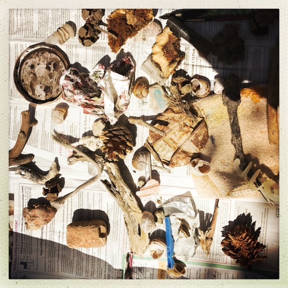 Anlage einer Sammlung von Fundstuecken aus diversen Materialien (Holz, Kunststoff, Gewebe, Schilf, Blech …) fuer die Verwendung im Atelier