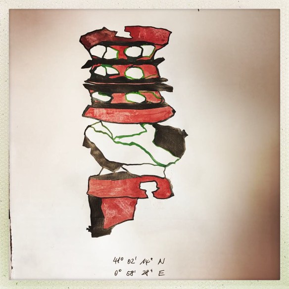 Und zum Andenken an Joan Miro und seinem Geburtstag hat er nun dreizehn schwarz – weiß – Skizzen auf der Basis dieser „OrtsMarken“ erstellt, die im Winter, wenn er wieder in seinem Atelier arbeitet, zu Papercuts oder großformatigen Holzschnitten werden sollen. Mal schauen!