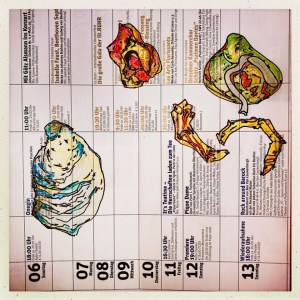 So, ein paar der am Strand gefundenen Muscheln hat Jürgen auf einen Kultur- Flyer der Stadt Essen gezeichnet – bestimmt für Beate, die so fleißig Muscheln lieferte. Als Leporello.
