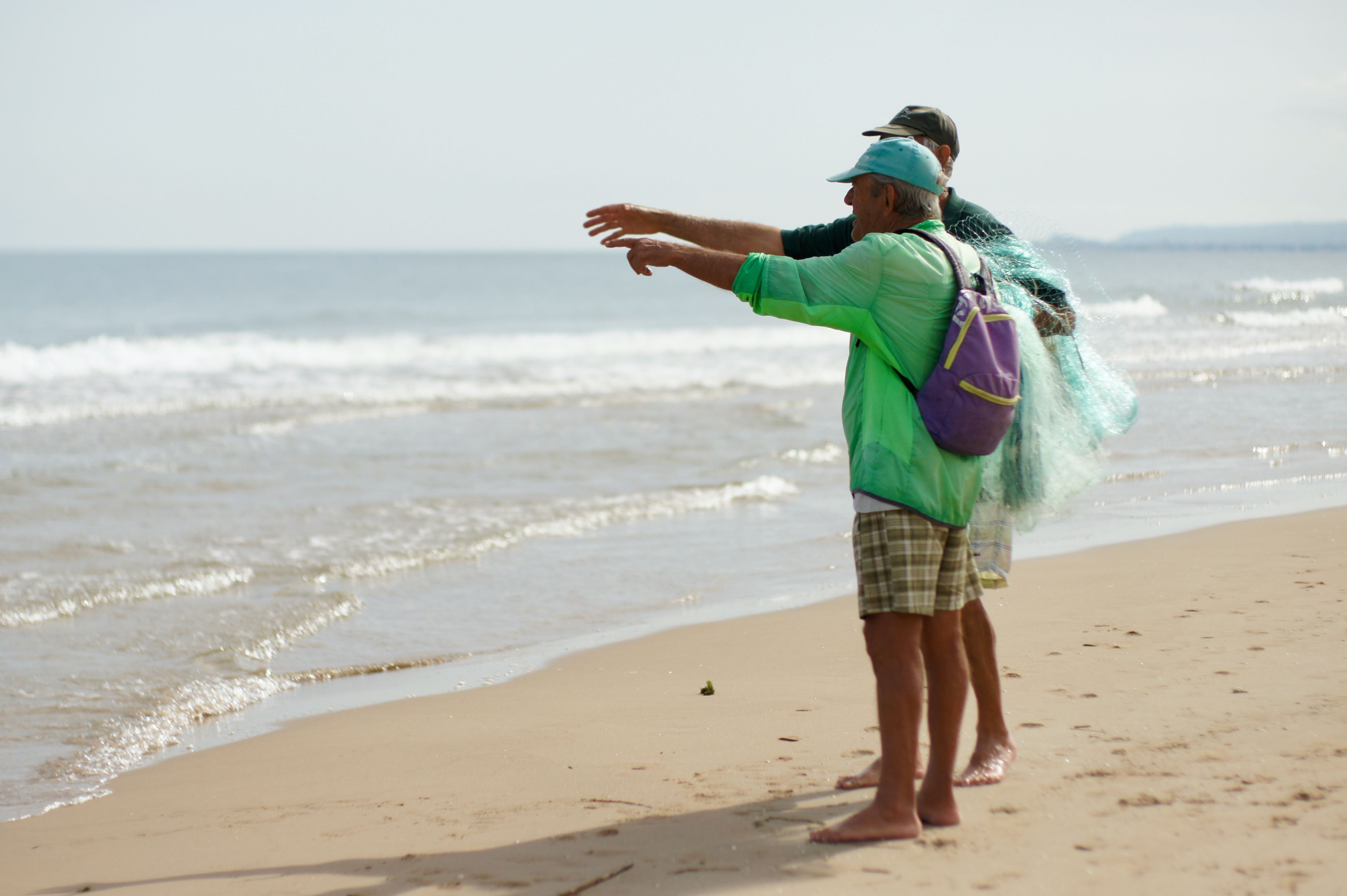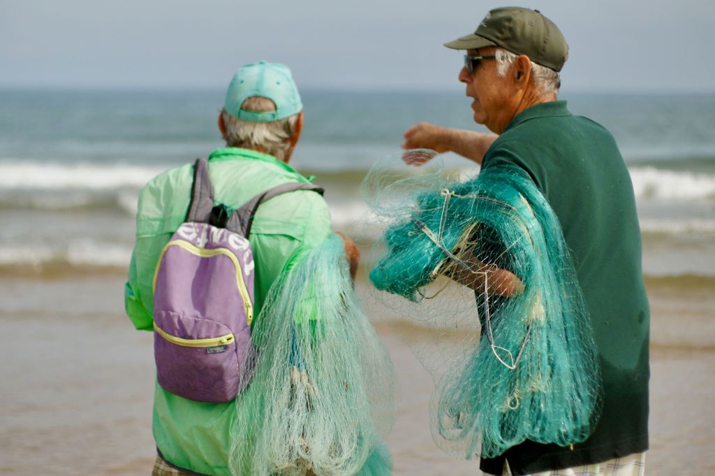 Diese beiden Spanier fischen, in der Brandung der Wellen stehend, mit einem Netz. Das Wasser wird vorher genau beobachtet und die Beobachtungen besprochen. Bis zur Brust steht man in den Wellen, und das Netz wird ausgeworfen und eingeholt. Es sah sehr anstrengend aus. Auch routiniert. Und ausgesprochen spannend. Drei wirklich große Fische lagen am Strand.