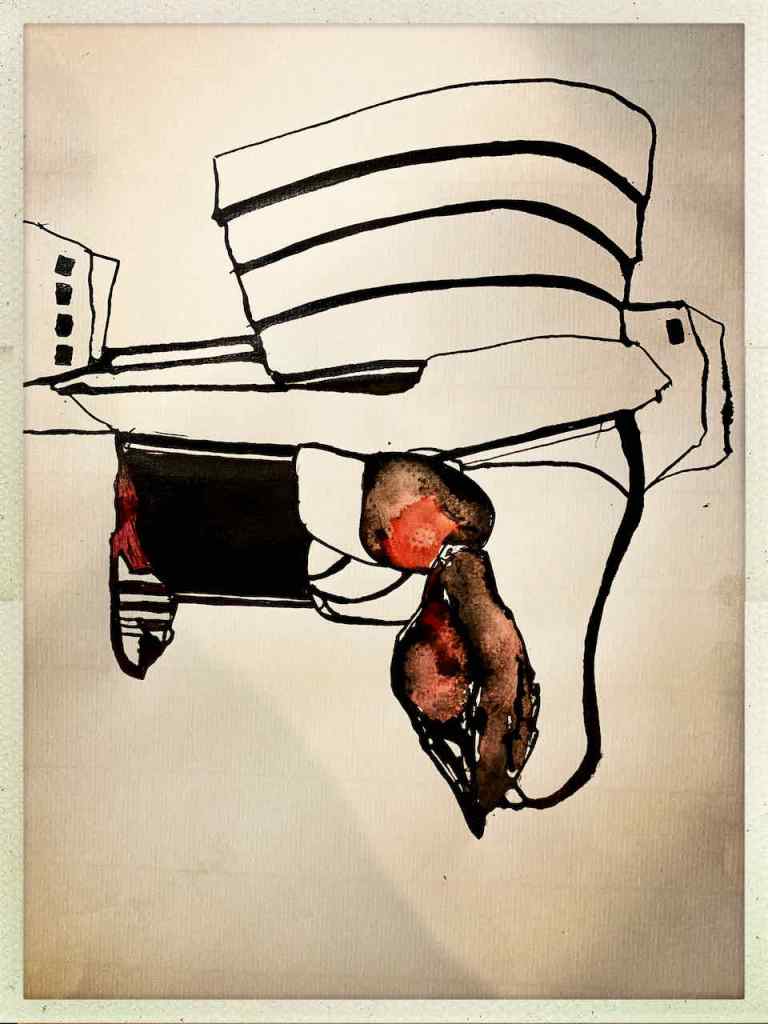 Damit hat Juergen gestern begonnen. An Kunstzeitschriften mangelt es in seinem zweiten Atelier zuhause wirklich nicht. Und natürlich blieb er beim Blättern in diesen an so manchem hängen, das auf Orte mit Harmoniekomplex oder Sehnsuchtpotential hinwies. Dann hat er erst einmal gezeichnet, den zeichnen klärt, und er fand einen mittelalterlichen Sakralbau, das ein Museum und einen gemalten Platz. Drei Orte, die Eden sein könnten. Drei mal Utopia – dieses Stichwort kam von „Klausbernd and the Fab Four of Cley“ und es scheint Jürgen zu inspirieren.