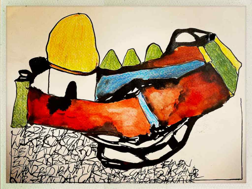 Der erste Tag im neuen Zwickelbüro 2020 war gestern. Ich war und bin der Chronist. Diese Rolle hat Juergen mir zugedacht, und ich mache das wirklich gerne. Und als Beobachter muss ich sagen, dass die Zwei, Antje und Jürgen, von Null auf Hundert gestartet sind. Es ging direkt in die Vollen. Das Projekt trägt, es ist in den Köpfen und das gerade auch in der Zeit zwischen den Treffen. Woran ich das merkte? Antje kam mit Geschenken für Jürgen: Einmal waren es Spielkarten der Inspiration aus dem Hamburger Bahnhof in Berlin. Und es waren diverse Hintergründe, extra für ihn geschaffen, die nun auf Juergens Linolschnitte warten – Jürgen strahlte.