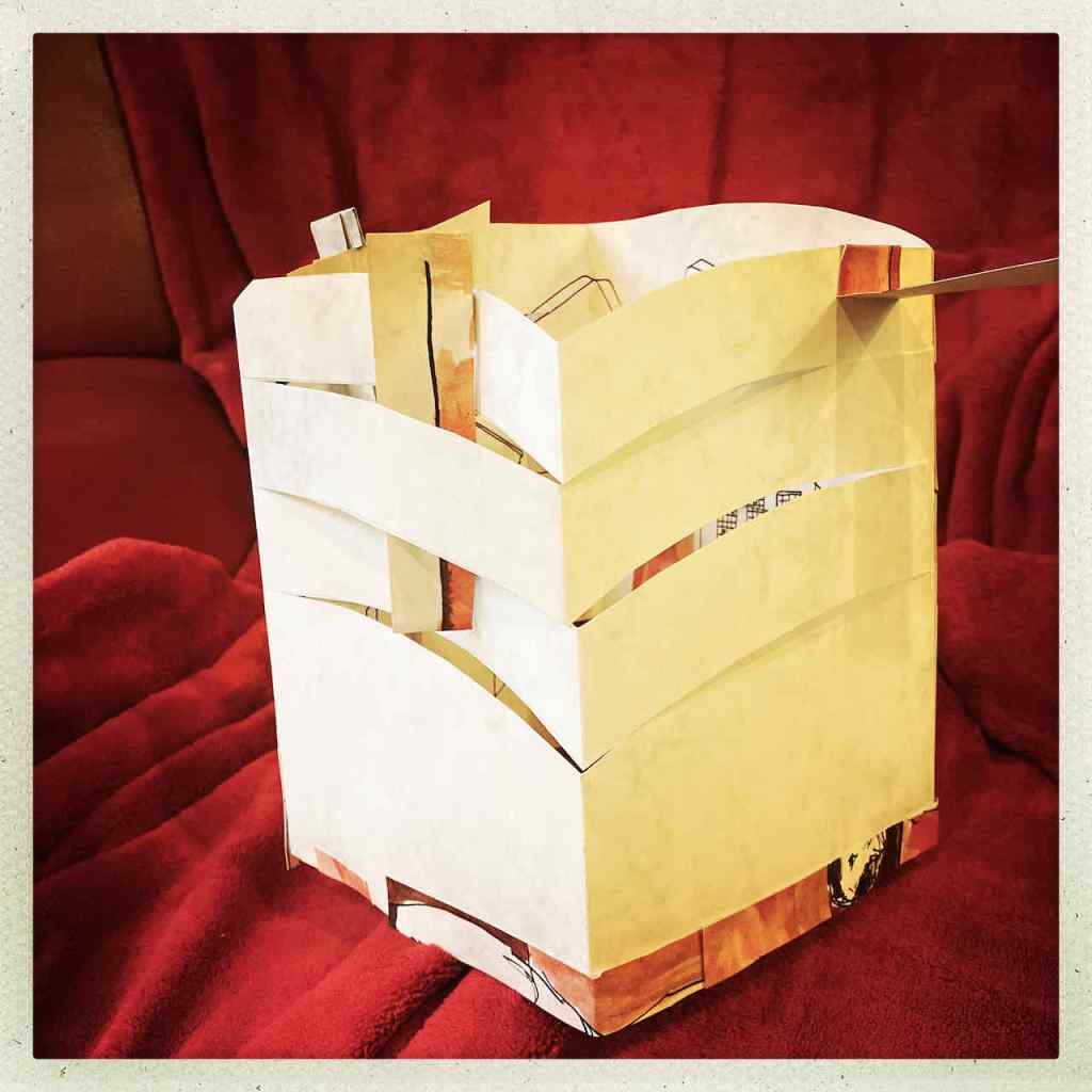 Und mit etwas Kleber und Papierresten entstand in diesem Zusammenhang noch ein viereckiger Turm, skizzenhaft, ein erster grober Versuch: vielleicht die Vorlage für ein Papierobjekt im großen Atelier – mal schauen.