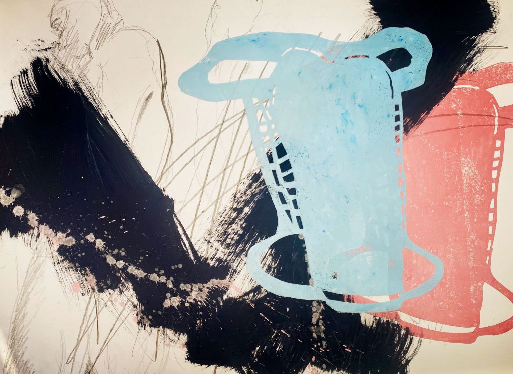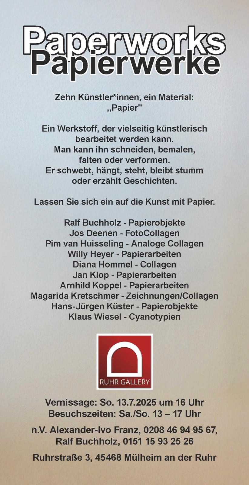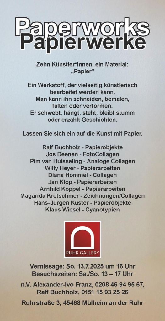 Jürgen sagt: “Ein Raum für mich ganz allein: das hat schon was“. Im Atelier hat er einiges zusammengesucht unter den Begriffen „Hoffnung / Ort /Dengel / light side mix und dann nach Mühlheim verfrachtet. Im Ausstellungsraum haben die einzelnen Exponate fast von selbst ihren Platz gefunden. Es sollte wie zufällig platziert wirken, was natürlich Quatsch ist, denn ein absichtloses Arrangieren gibt es nicht. Er habe es danach so gelassen, wie es war.