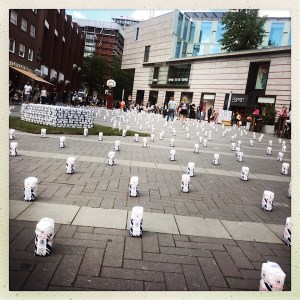Wir wollen zur „Kunsthalle“ im Speicher2 am Hafen, wo sich auch die vielen Ateliers befinden, dem Picasso-Museum in der Stadt und dem LWL – Museum. Dann haben wir erfahren, dass es an zwei Tagen verteilt in der gesamten Stadt das Projekt „Flurstücke“ zu sehen gibt: Theater und Performances. Also: Mal schauen!