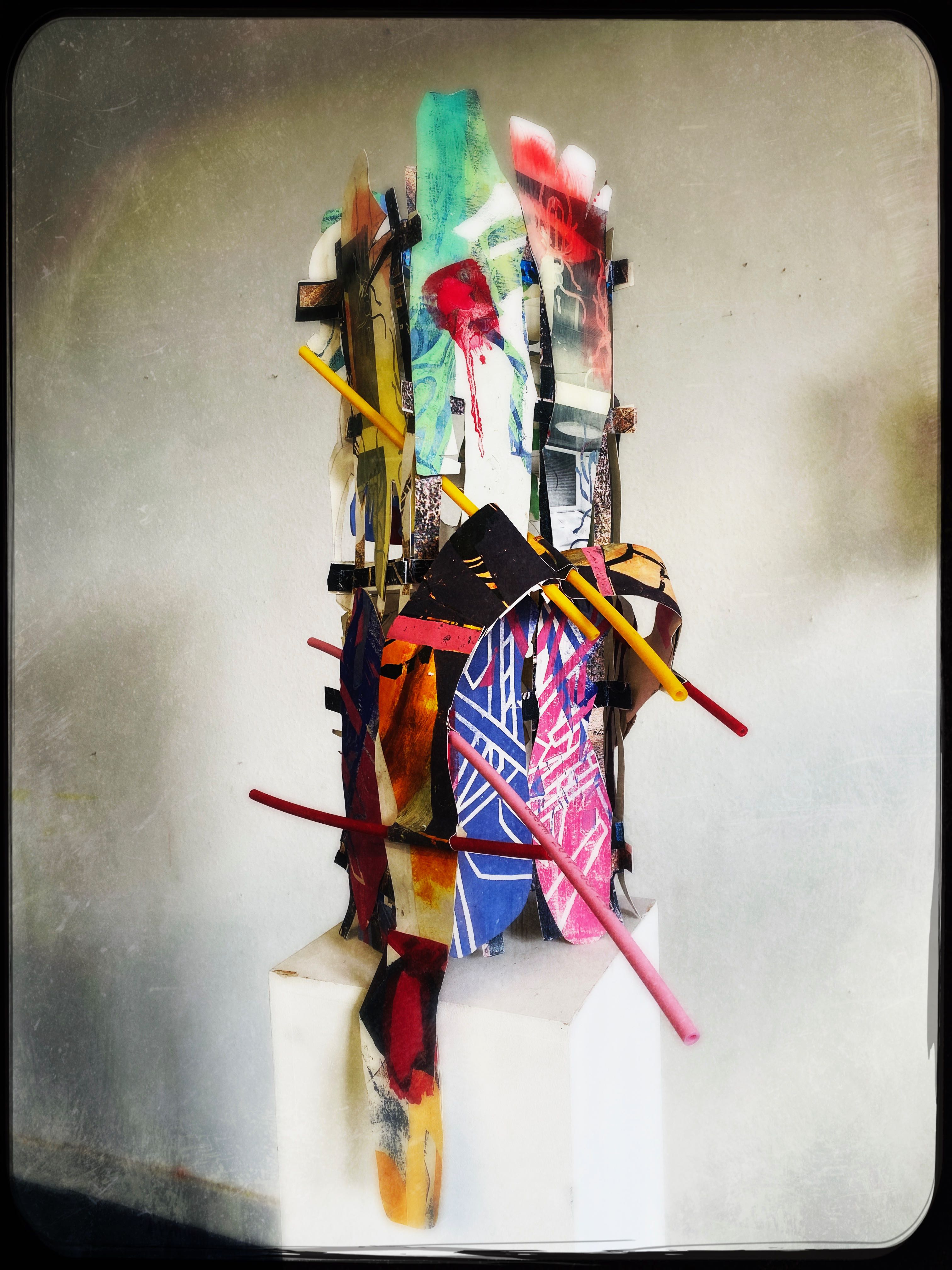 Und da er die Papierarbeiten auch immer gerne um etwas Plastisches, ebenfalls aus Papier ergänzt, ist ja genug im Atelier vorhanden, sind weitere drei Kronen entstanden. Sie gehören zu den „corona notes“.