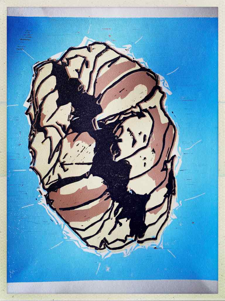 Damit ist er dann ins Atelier gezogen. Und nachdem der Probe-Druck stand, überkam Jürgen wohl ein Anfall von digitalem Spielen. Also hat er auf seinem iPhone mit einer Gestaltungsapp und dem Photo des Abdrucks herumgespielt. Was natürlich zur Folge hat, das eine Vielfalt von Ergebnissen entstand und er auswählen musste. Übrig blieb dann das hier: