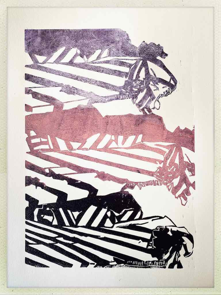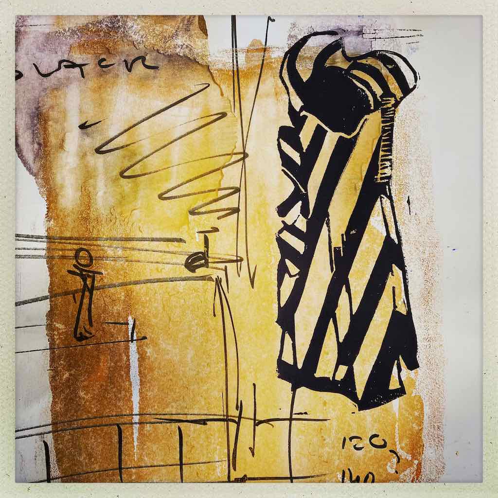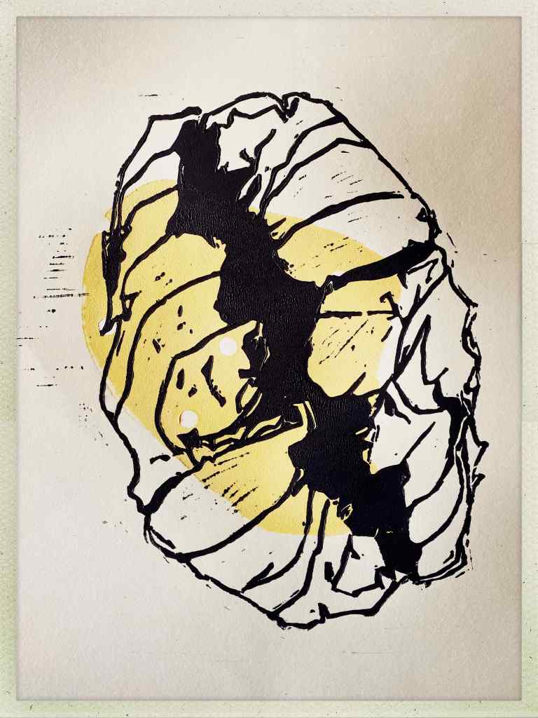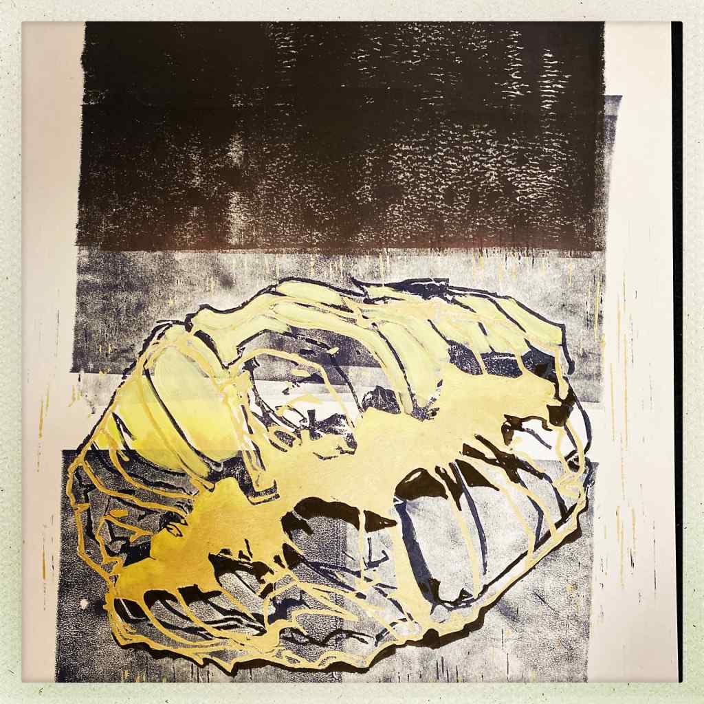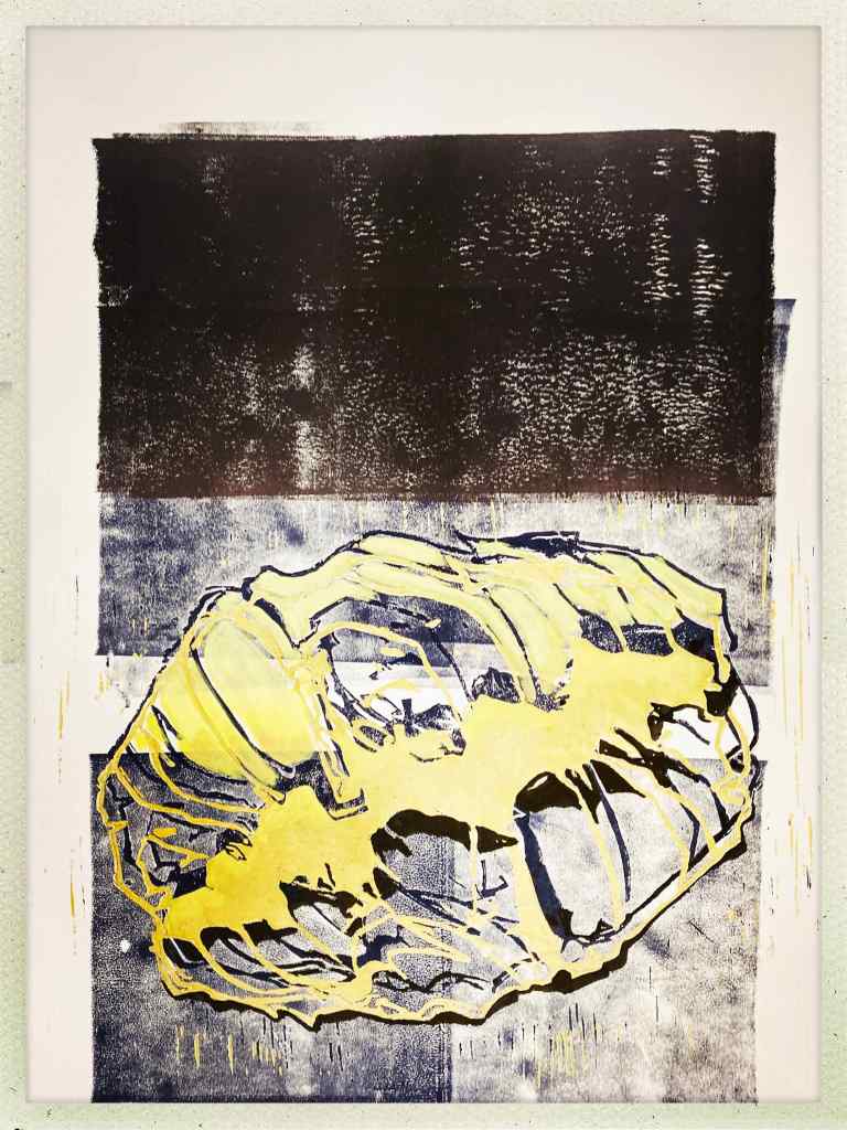 Und Juergen hat gestern seine riesige Linolschnittplatte weiter bearbeitet, mit der Musik im Hintergrund gesummt, gepflötet und gesungen und war weiterhin auf der Suche nach einer Form des Zwickels, die er noch nicht bearbeitet hatte. Die Platte hat er in verschiedenen Variationen gedruckt.