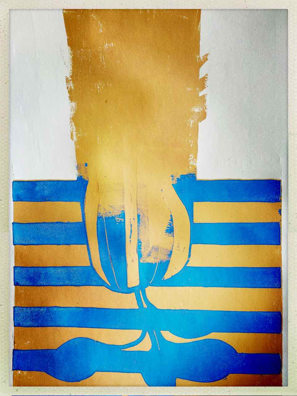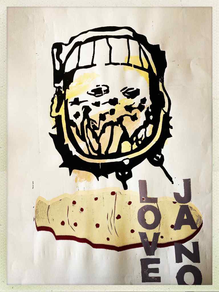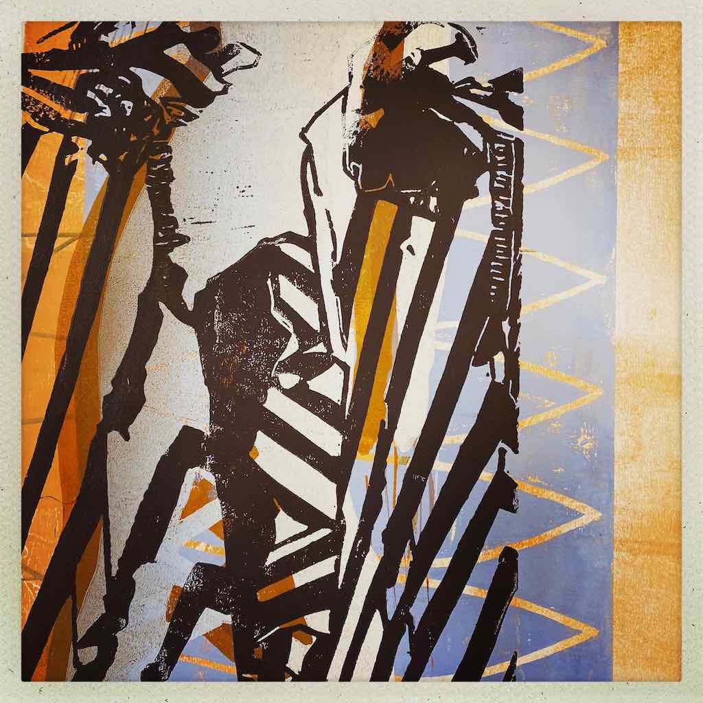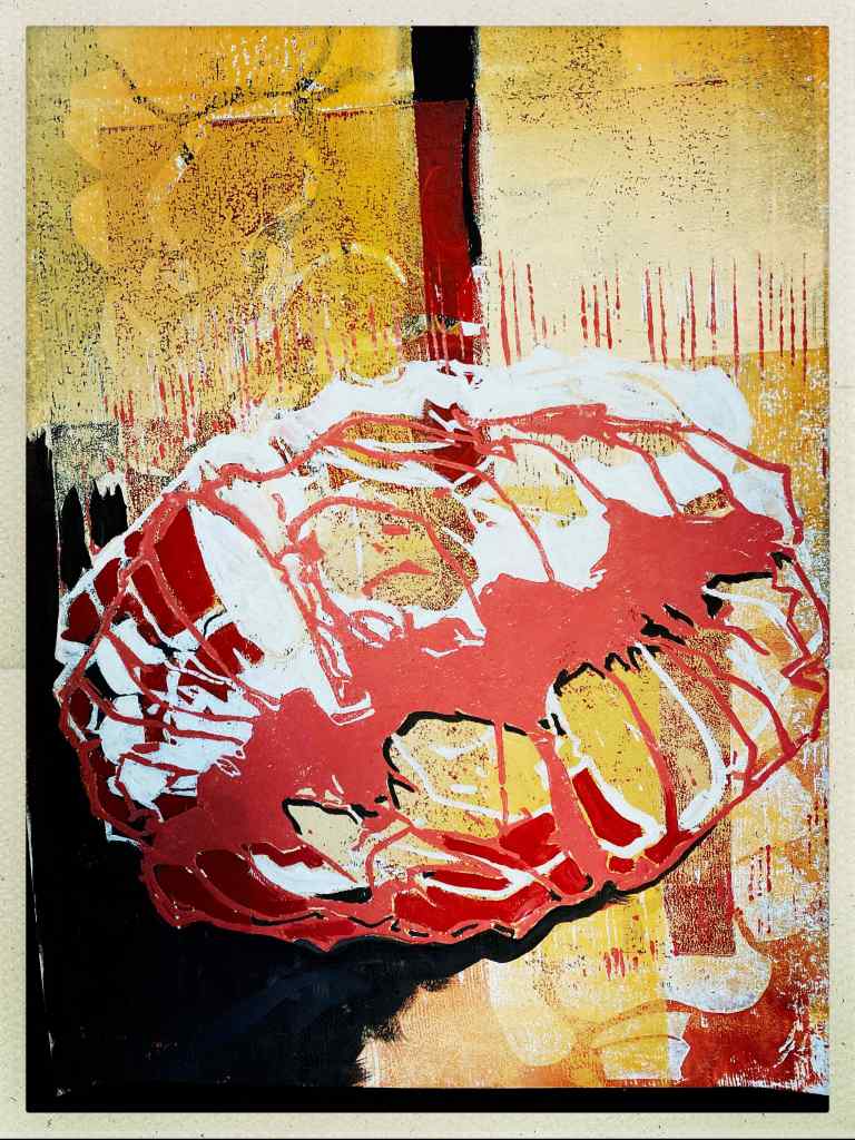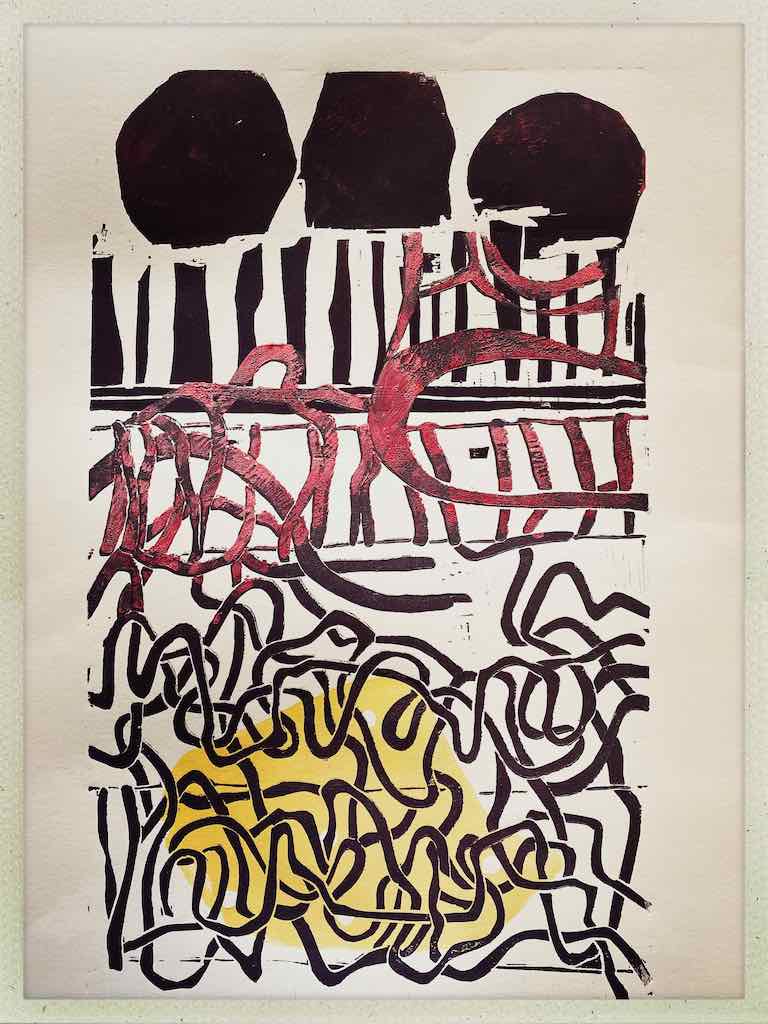 Und Juergen hat gestern seine riesige Linolschnittplatte weiter bearbeitet, mit der Musik im Hintergrund gesummt, gepflötet und gesungen und war weiterhin auf der Suche nach einer Form des Zwickels, die er noch nicht bearbeitet hatte. Die Platte hat er in verschiedenen Variationen gedruckt.