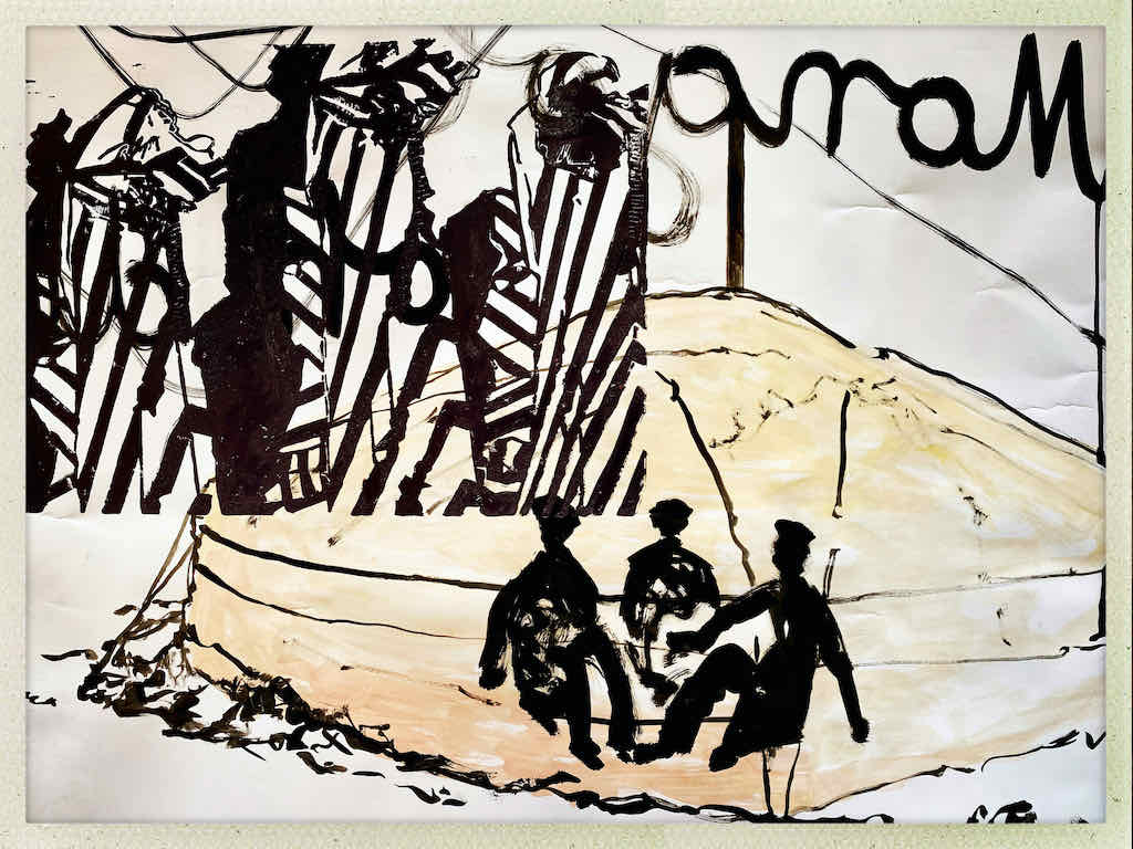 Daraus geworden ist dann dieser komplette Satz: #77 – S: „Eine Runde drehen ist wie …“J: “… im Kreis gehen, Stillstand?” Und das obige Bild hat er dann ohne groß nachzudenken im Atelier „zusammengebastelt“.