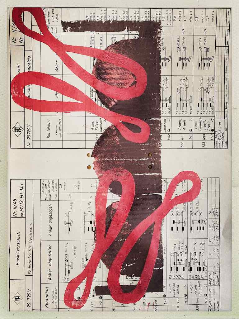Antje meinte zu Jürgen gestern, dass ihre Ergebnisse mit dem Gehirnzwickel zu tun hätten. Da gebe es ja im Stammhirn einen Bereich, den man Zwickel nenne. Der wurde schon im letzten Zwickelbüro untersucht. Gestern gab es die Fortsetzung. Antje hat sich von Jürgen eine alte Druckplatte aus seinem Bestand geschnappt, auf ihren Hintergründen gedruckt – Antje ist Spezialistin für vorgefertigte Hintergründe auf Rentenpapier – und hat das Ergebnis malerisch bearbeitet -so erreicht sie Tiefe und Plastizität. Sie mischt das Drucktechnische mit dem Malerischen.