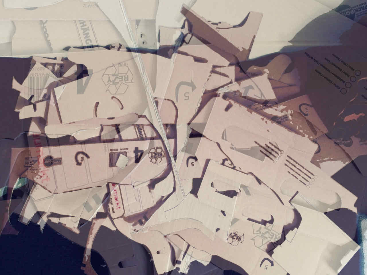 Es ist nicht zielgerichtet, es ist nicht auf ein bestimmtes Ergebnis gerichtet, Das Material lag herum. Also könne man es auch irgendwie zerschneiden und verkleben. Das geht ja irgendwie immer. Meinte Juergen.