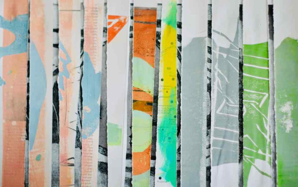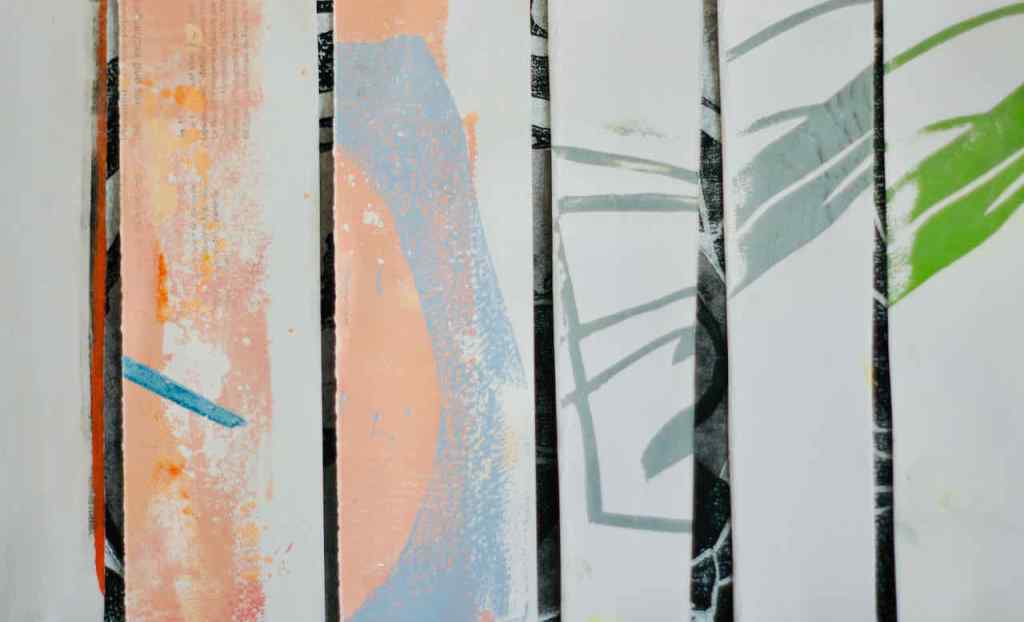Keine Frage: Juergen hat sich gelangweilt. Er ist durch die Ateliers der Ateliergemeinschaft in Geldern „gestromert“, hat zu dem einen oder anderen Fenster rausgeschaut, und landete im gemeinsamen „Raum fürs Grobe“, da wo die Werkbank steht und die Maschinen auf ihren Einsatz warten. Dort hat er den Müll durchsucht und eine bemalte Pappe gefunden. Die Malgruppe von Andrea entsorgt da schon mal einiges. Mit dem Cuttermesser hat er seinen Frust an diesem Stück ausgelassen, es zum Druckstock erklärt und heute dann abgedruckt. Zuerst hat er sich gefragt, was da geschehen und was da entstanden ist. Aber dann hat er zusätzlich gezeichnet und das Gedruckte ergänzt.