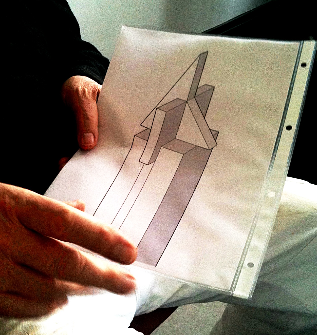 Wir haben geredet. Rudolf hat eine Zeichnung aus der Tasche gezogen. Darauf war der Entwurf seiner neuen Plastik zu sehen. Das Wort „Konstruktivismus“ stand im Raum, aber Rudolf meinte, dass er da keinen Bezug zu habe. Diese kunsthistorische Strömung habe für ihn keine Bedeutung. Die geometrischen Figuren, insbesondere der rechte Winkel, seien für ihn schon etwas Besonderes. Da habe er eine Affinität zu.