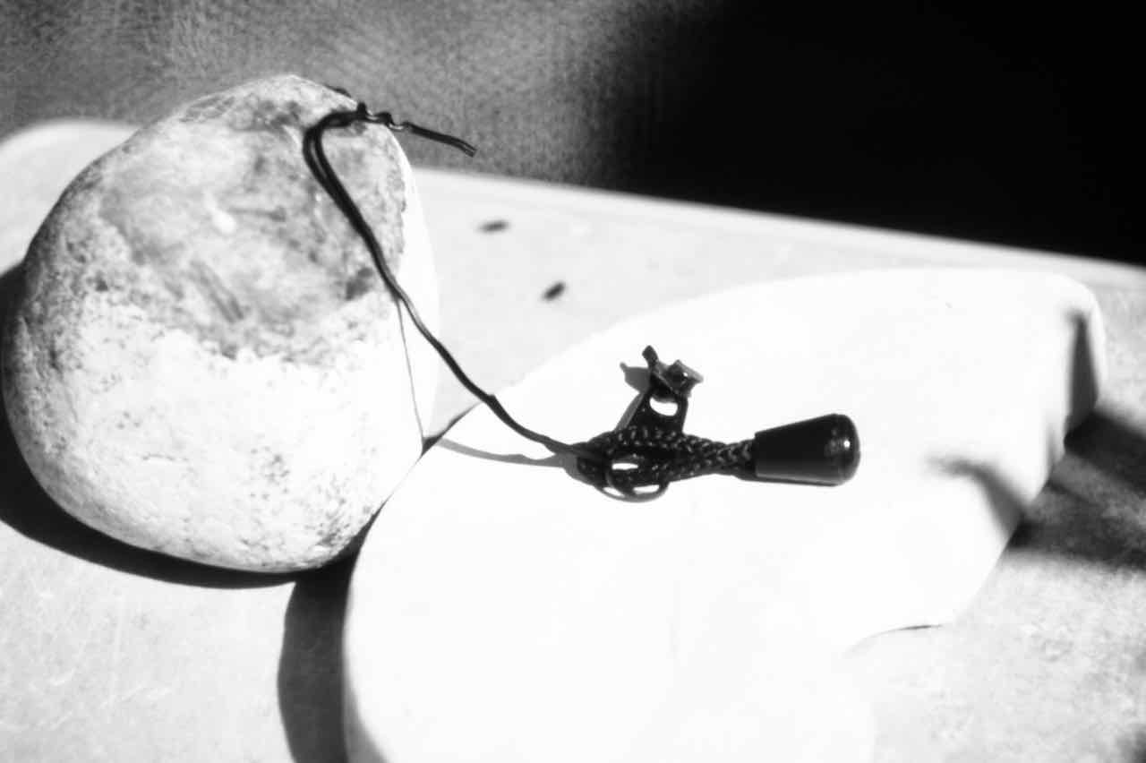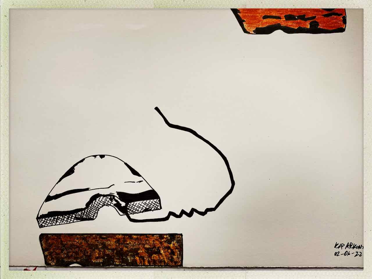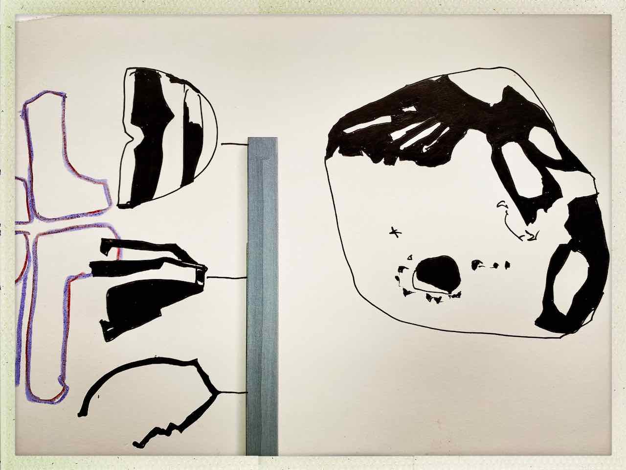 Die selbst auferlegten Handlungsanweisungen für Jürgens künstlerisches Agieren auf Rügen waren klar: OrtsMarken suchen, zeichnen, fotografieren und mit den Ergebnissen spielen. Gefunden hat Juergen im Sand auf Rügen den Rest eines schwarzen Reißverschlusses. Und einen Stein. Und ein Keramikteil.