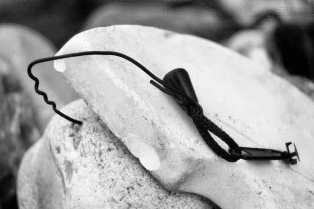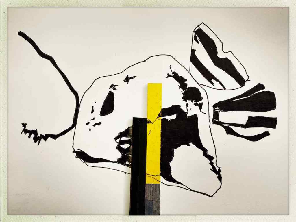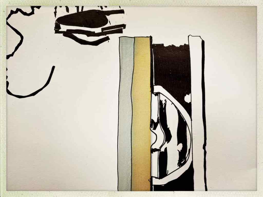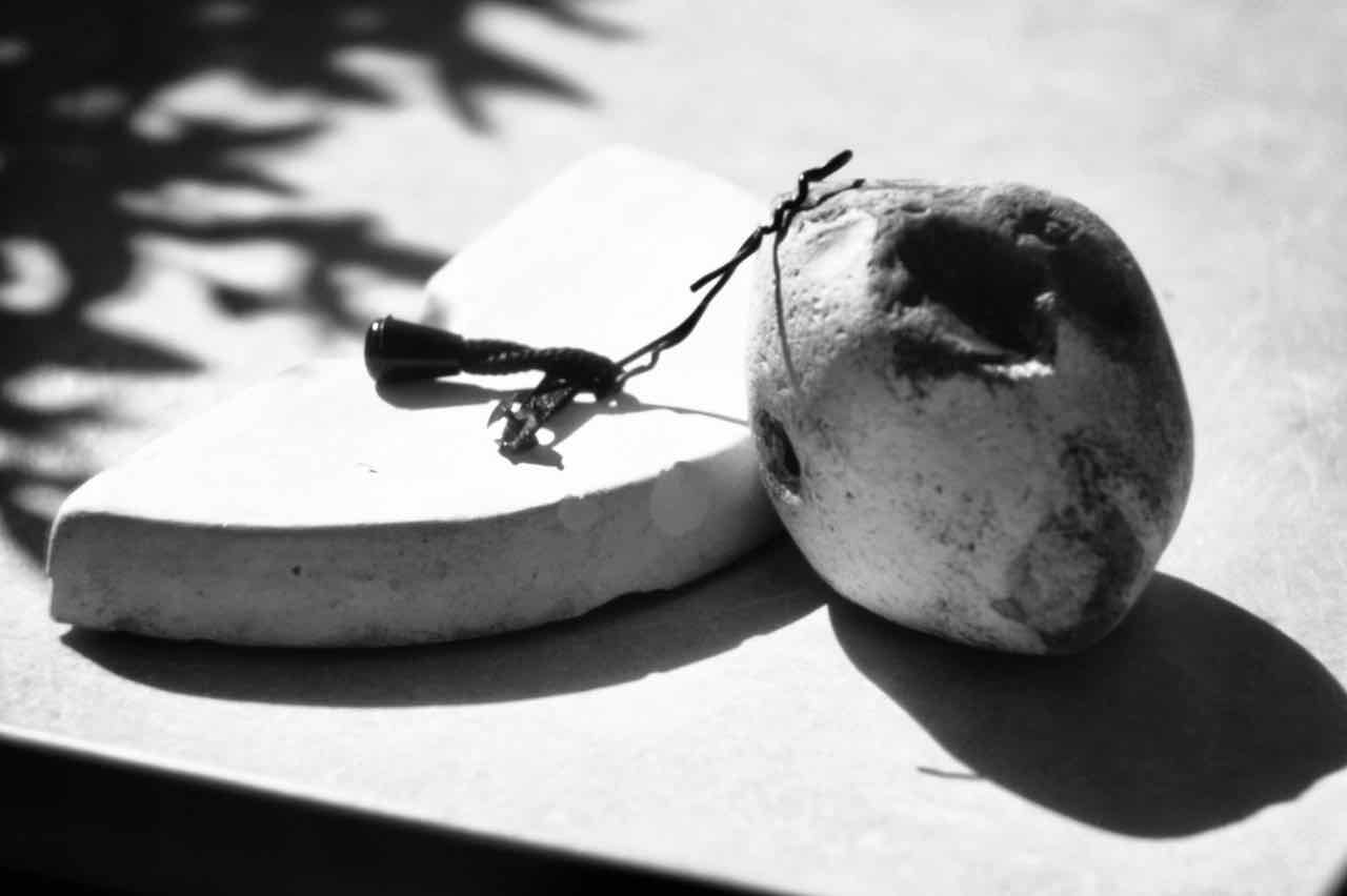 Die selbst auferlegten Handlungsanweisungen für Jürgens künstlerisches Agieren auf Rügen waren klar: OrtsMarken suchen, zeichnen, fotografieren und mit den Ergebnissen spielen. Gefunden hat Juergen im Sand auf Rügen den Rest eines schwarzen Reißverschlusses. Und einen Stein. Und ein Keramikteil.