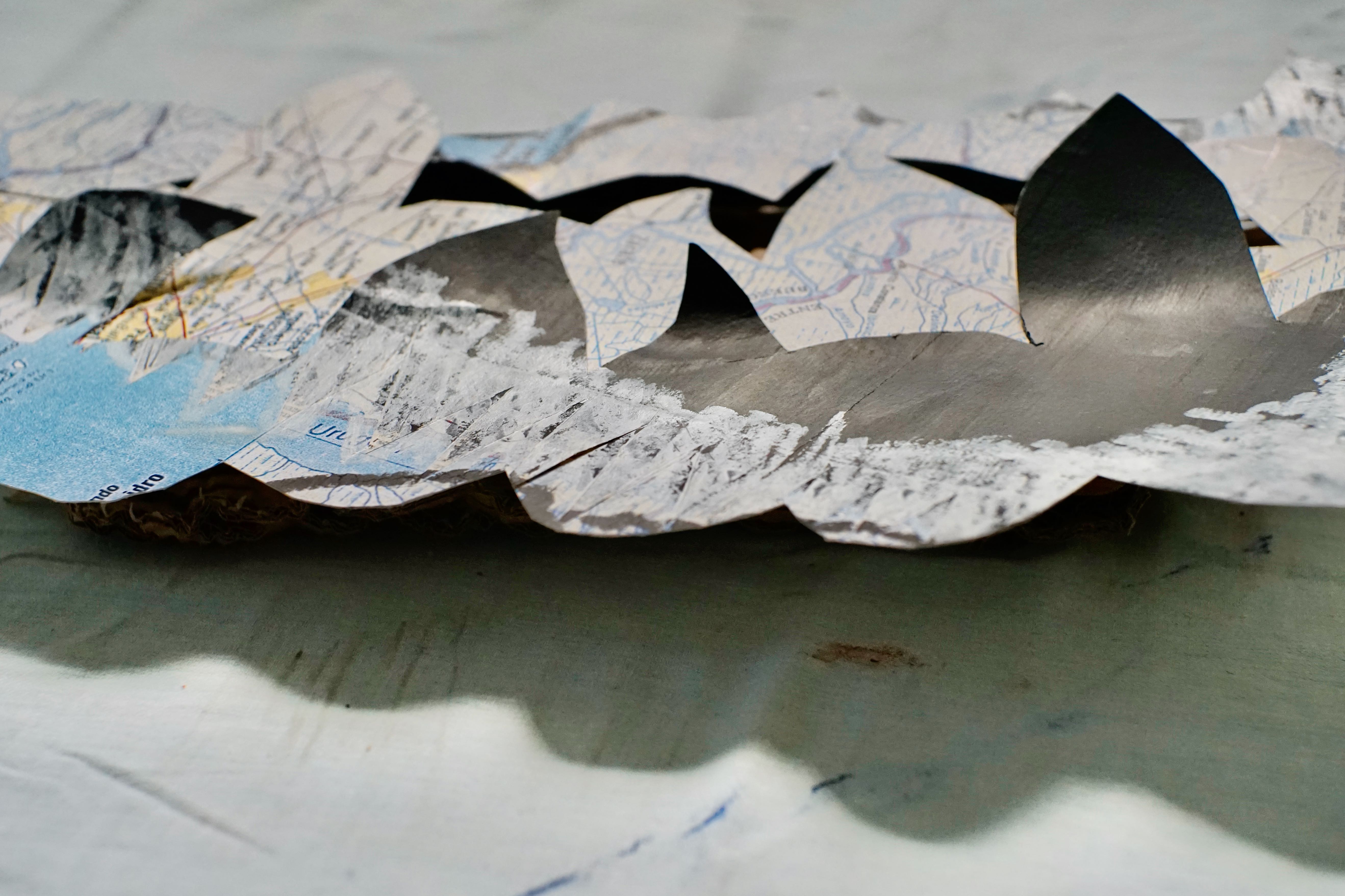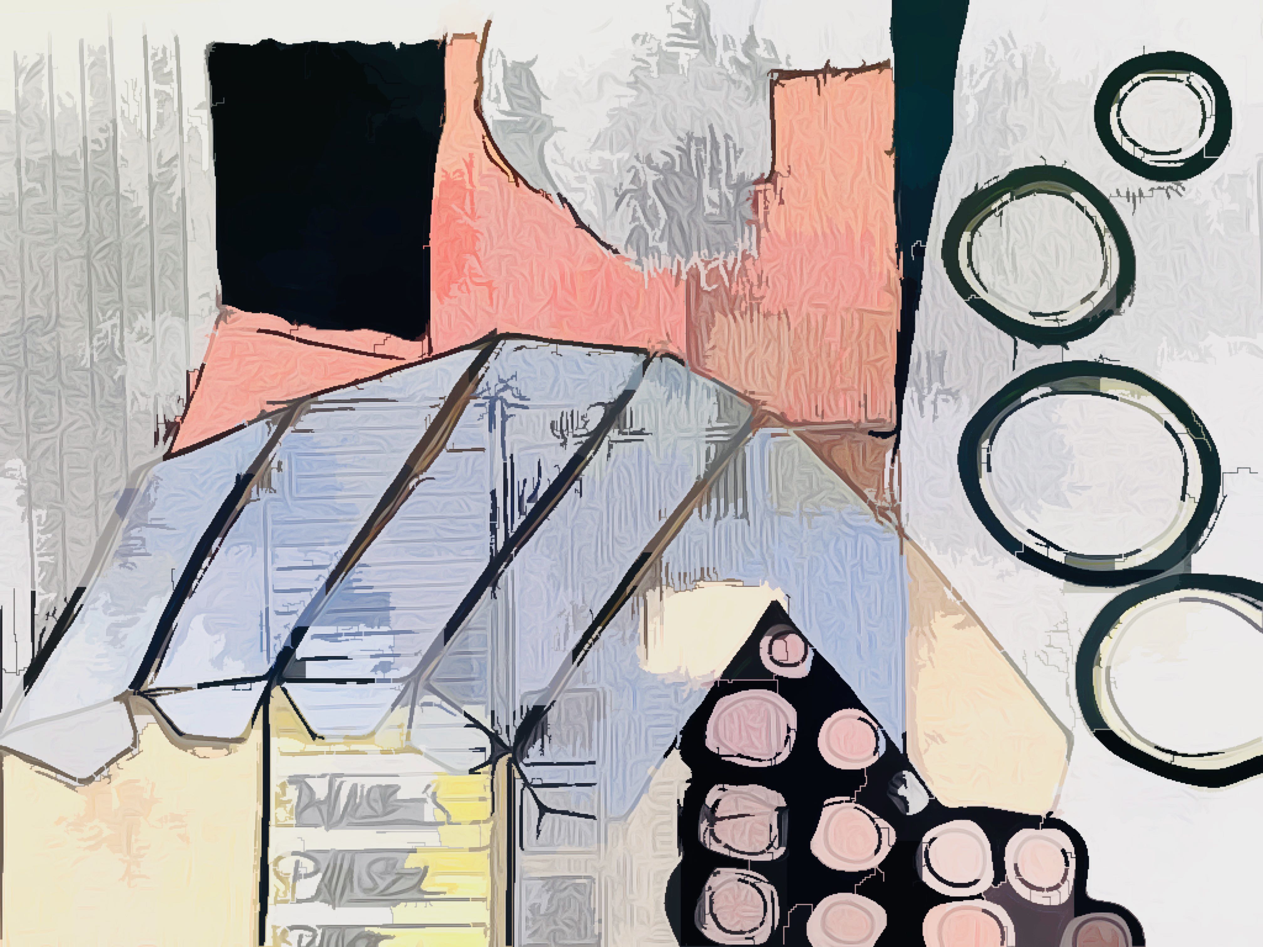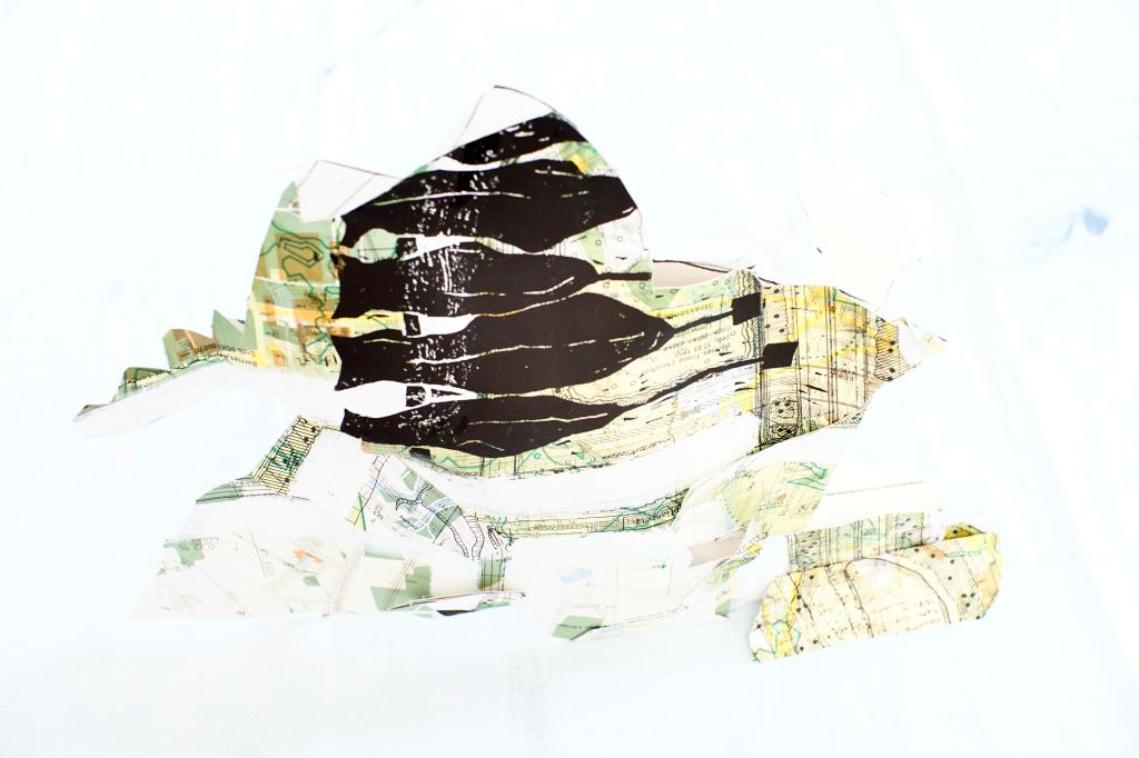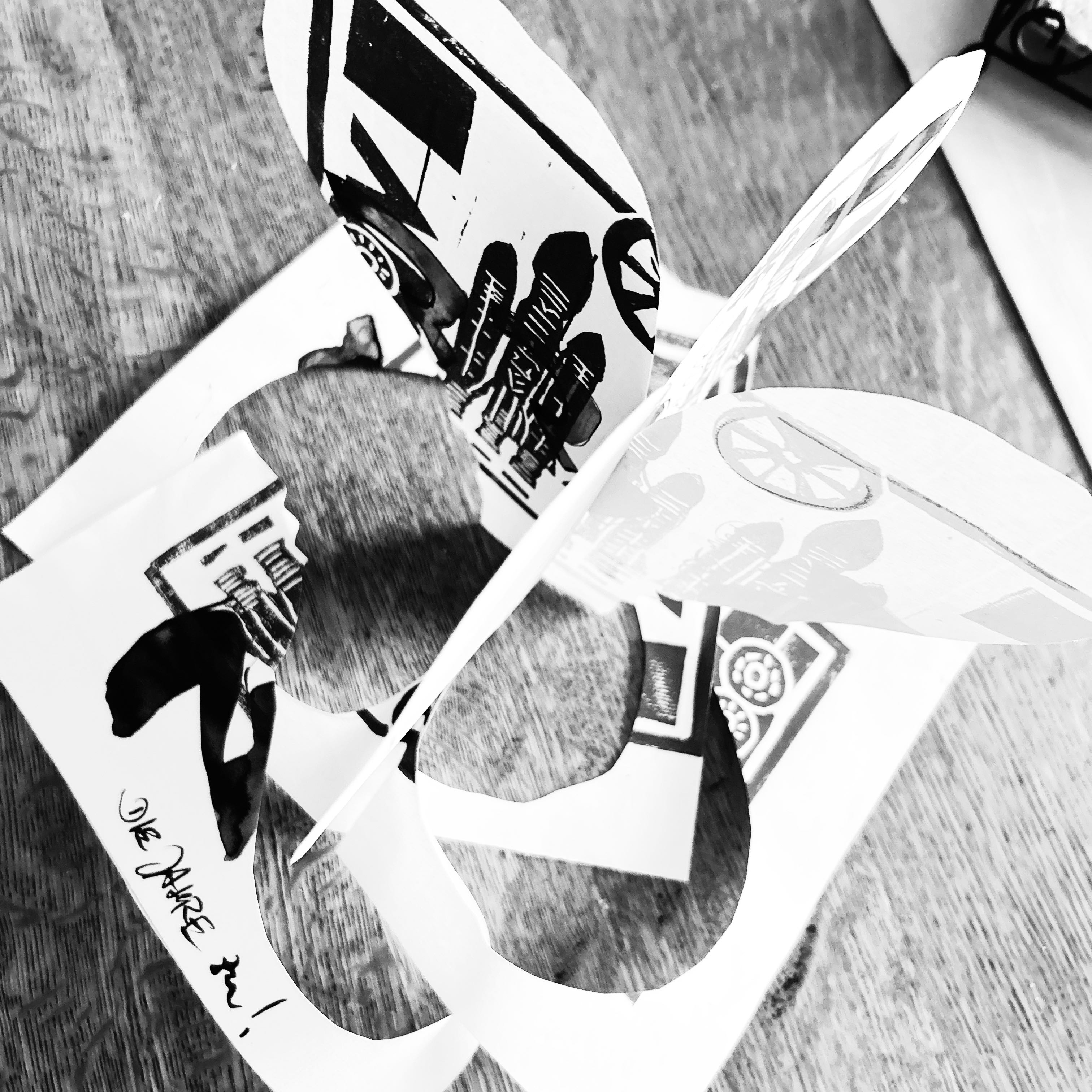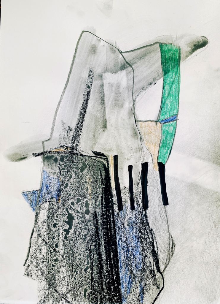 Ein Teil der Zeichnungen und ein Collageversuch von Jürgen gestern bedurften gewisser Entscheidungen, denn dem zweiten Blick einen Tag später hielten sie nicht stand. Im Mülleimer sollten sie aber auch nicht landen. Jürgen hat sie für eine kleine und wilde Papierskulptur genutzt. Er hatte mächtig Gefallen am Ergebnis.