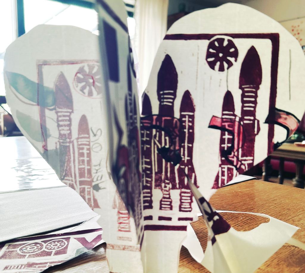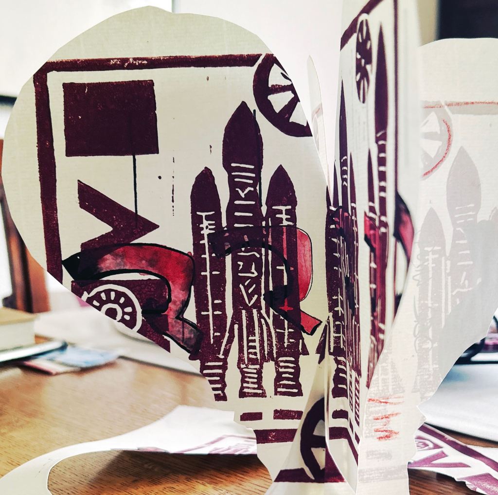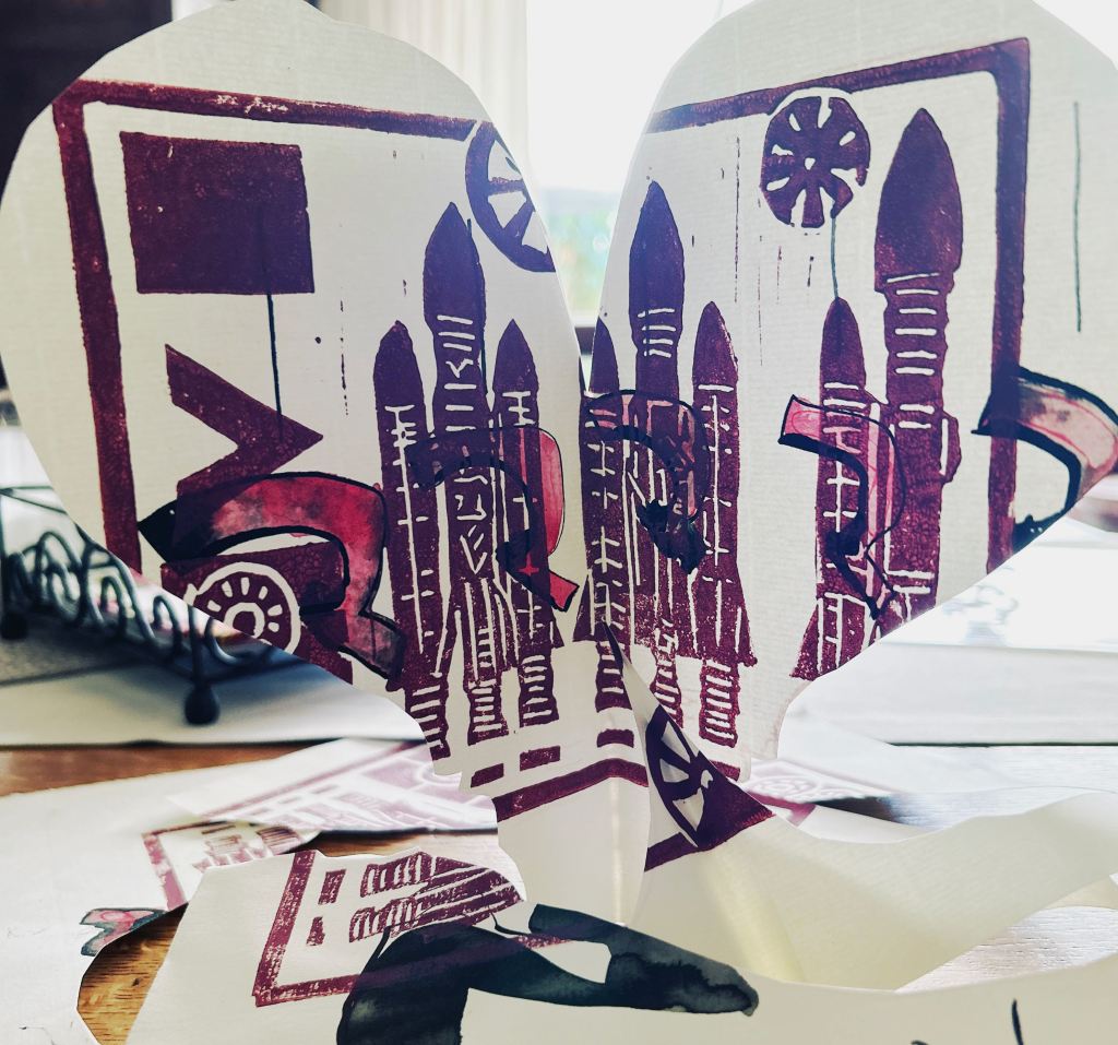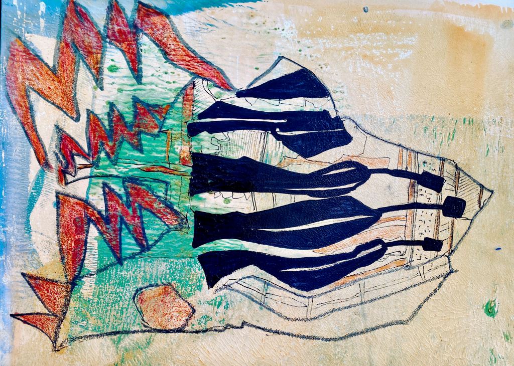 Dass da so viele zeichnerische Boote im Laufe der letzten Monate entstanden seien, sei schon verwunderlich. Die Boote seien seit letztem Jahr auf seinen Reisen einfach so zu ihm gekommen. Das erzählte mir Juergen heute morgen als wir über seinen ersten Versuchen der „Boots-Monotypien“ standen. Zwei Skizzenbücher seien voll mit schnell hingeworfenen Bootskörpern oder ähnlichen Formen. Ein kleines Boot aus Pappe sei auch schon gebaut worden. Um zu verstehen.