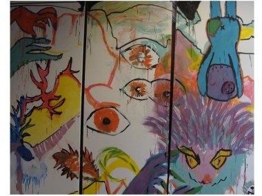 Juergen und Boris hatten ebenfalls Anteile am Projekt: Boris hat die Keilrahmen für das Bühnenbild bespannt und Juergen hat mit zwei Schülerinnen das Bühnenbild gemalt – eine Zwischenwelt, die von tierischen Wesen beherrscht wird. Mal sehen, ob das Motiv Auswirkungen auf die Tanzinhalte in der nächsten Woche hat.