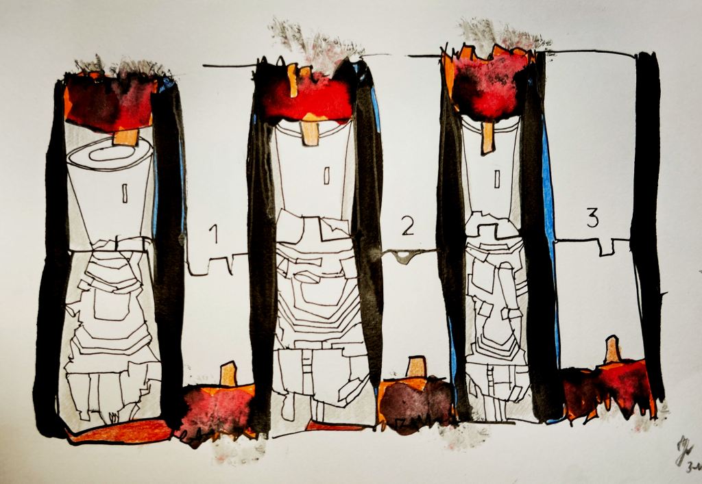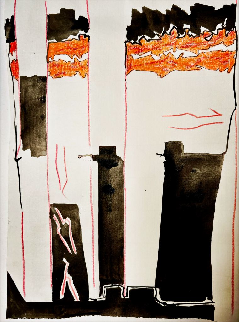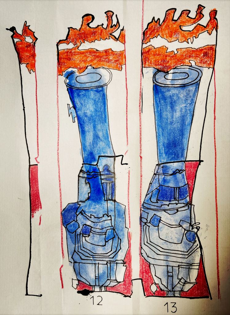 Ein neuer Durchlauf, der Vierte, startet mit diesem Foto, das einen „Turm der Hoffnung“ zeigt. Durchlauf, das bedeutet: Foto – Zeichnung – Scherenschnitt – Druck, Grafik – Papierobjekt. Das ist die Abfolge, in der Jürgen das Thema „light side mix – Hoffnung“ kleinarbeitet- nach dem Prinzip von Vorgänger und Nachfolger.