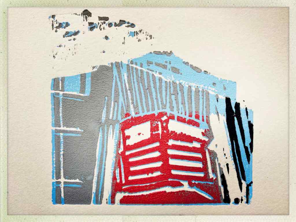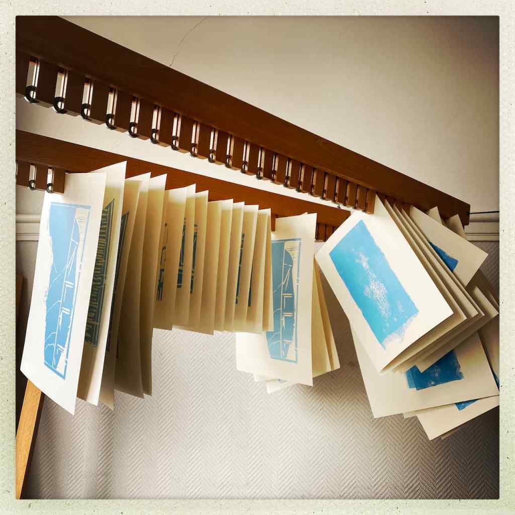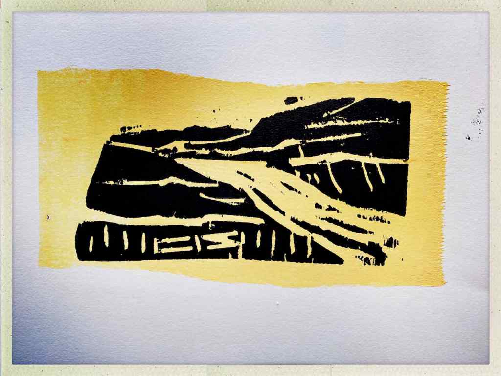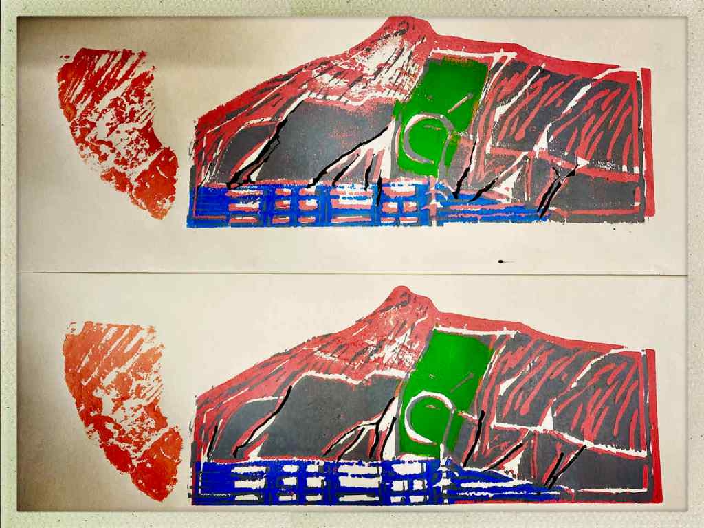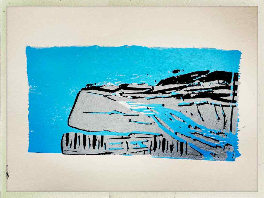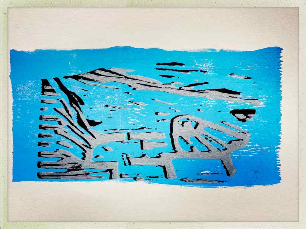 Neun Motive als Holzschnitte sind es geworden. Und das ging so: Reste von Holz gesucht, in das sperrige Zeug die Motive geschnitten, das Splittern in Kauf genommen, das Verschneiden zum gestalterischen Prinzip erhoben, Vorabdrucke in schwarz/ weiß erstellt und dann den Rest nach dem Prinzip der verlorenen Platte mit verschiedenen Farben realisiert, Titel: schauen, staunen, schlucken – Norwegen.