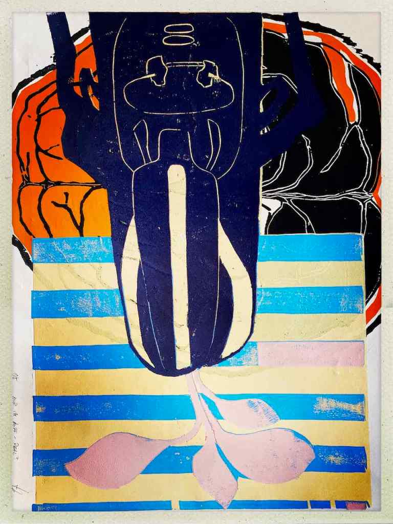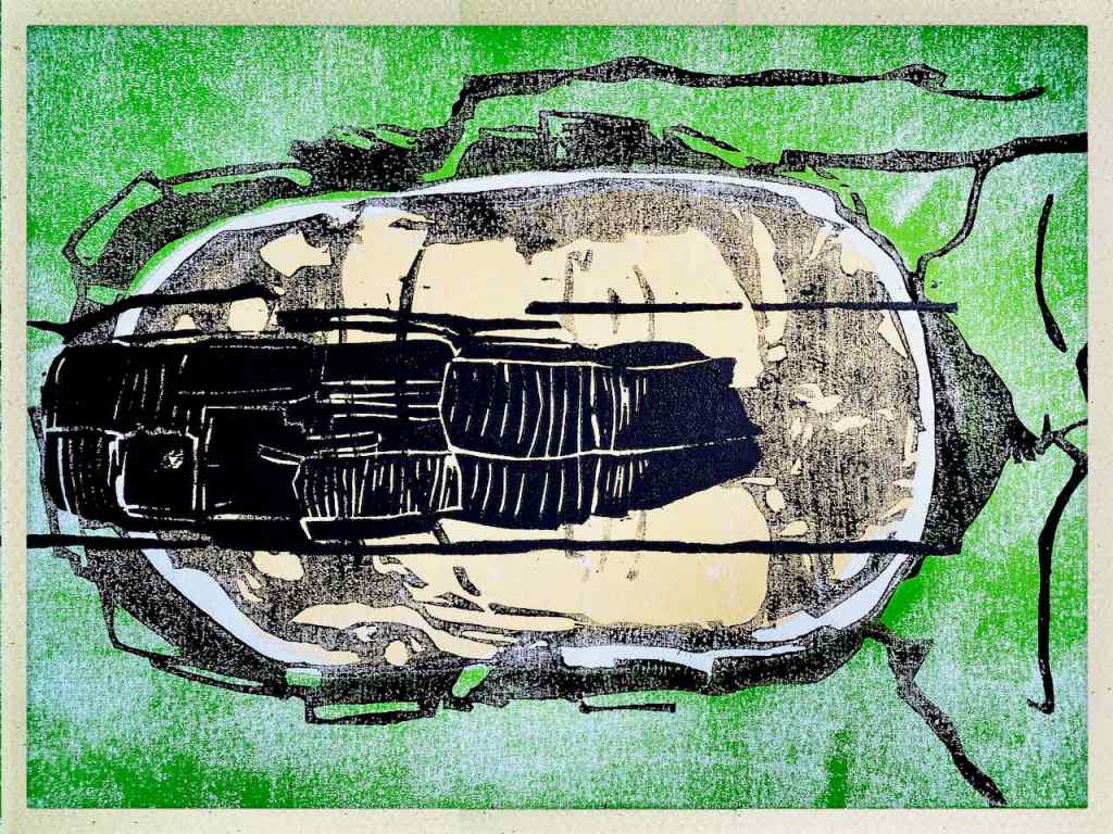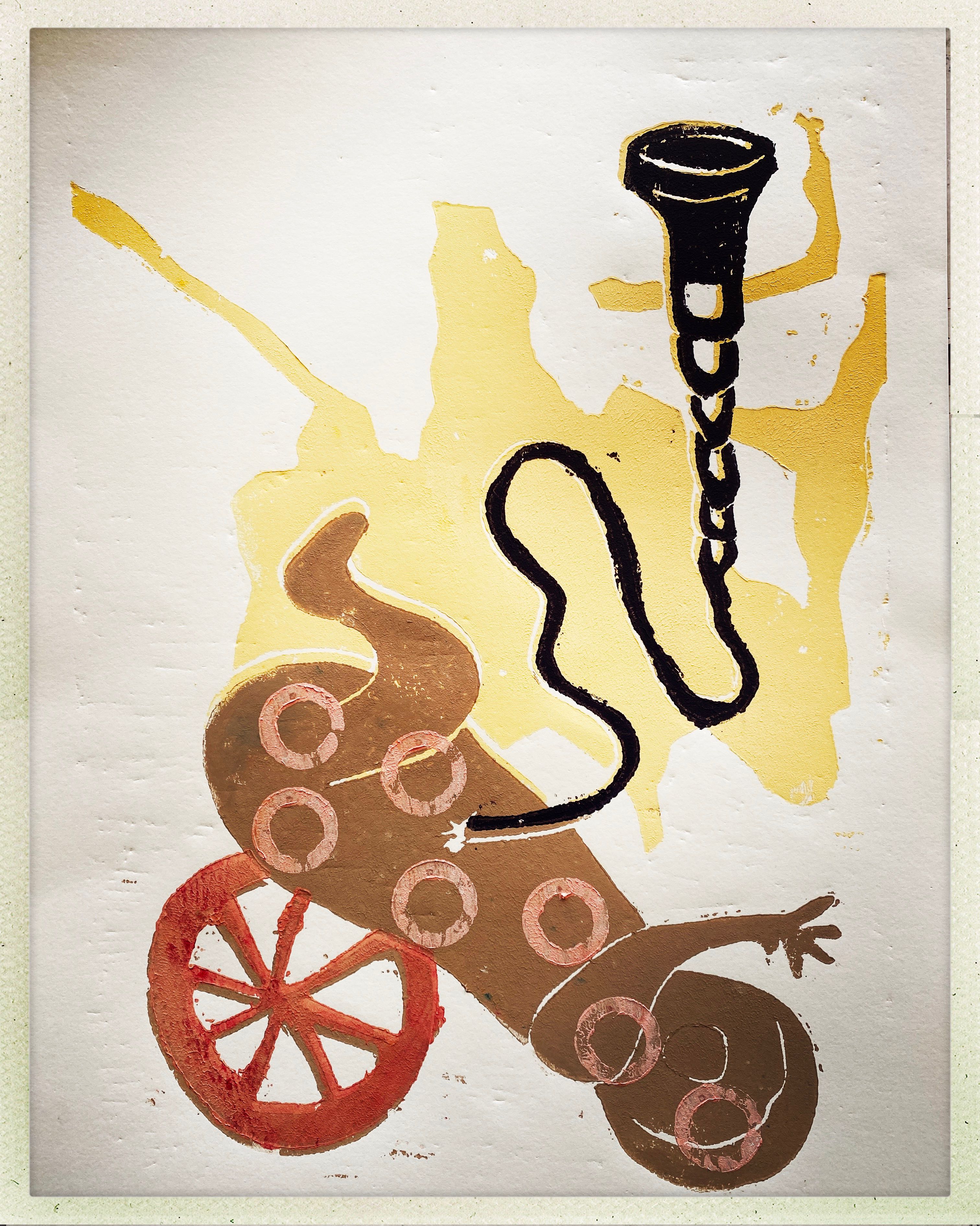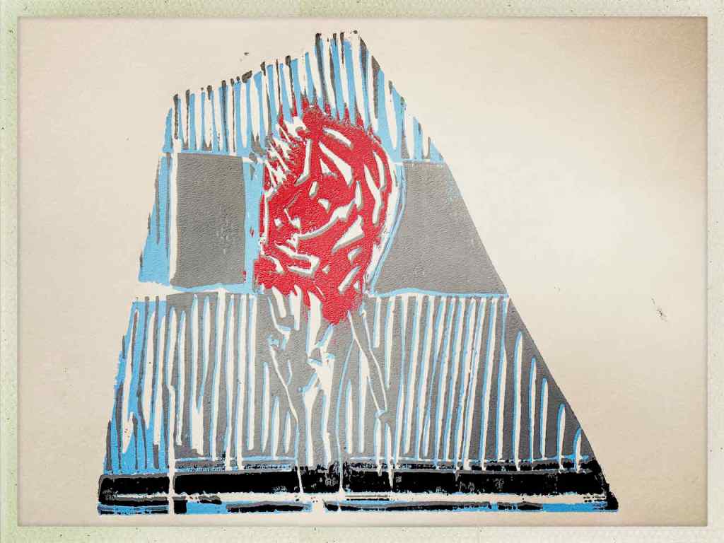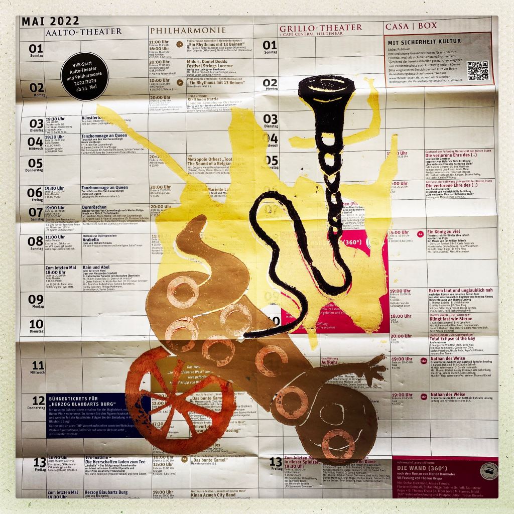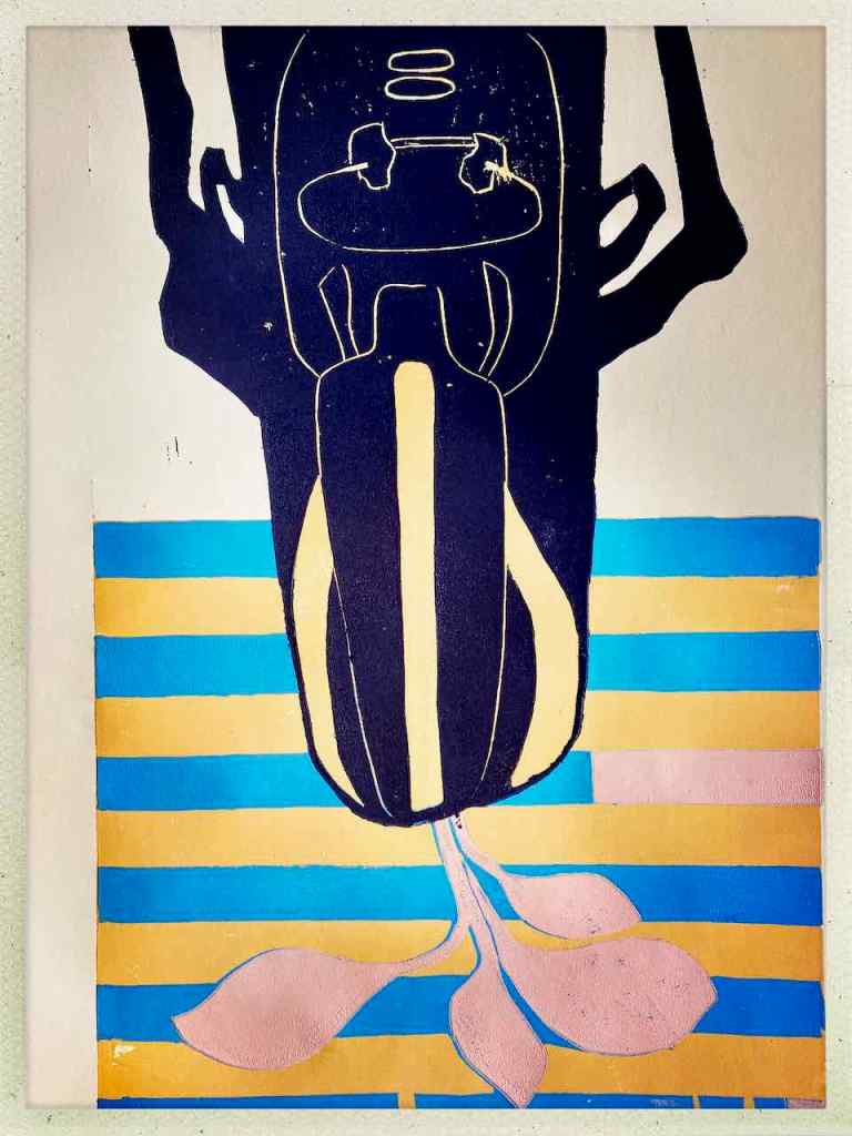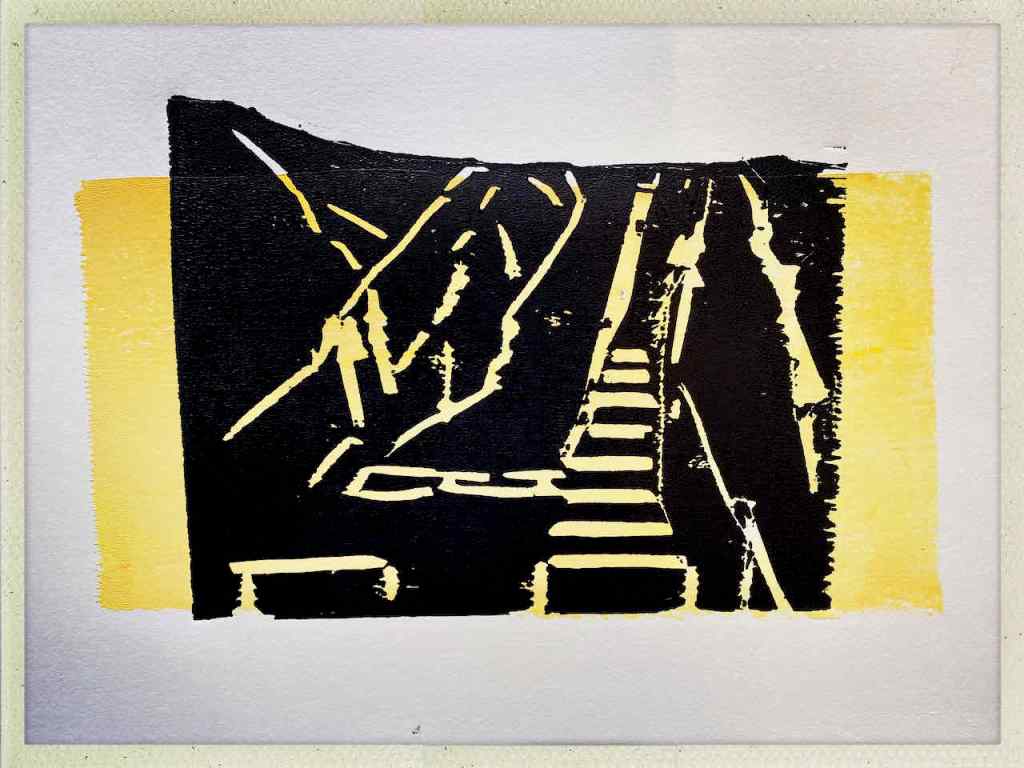 Entstanden ist nun, schnell – schnell – schnell, ein Holzschnitt nach dem Prinzip der verlorenen Platte mit dem Titel „schauen, wundern, schlucken“. Dieser Titel fasziniert ihn, und er scheint sich für mehr zu eignen. So sagte er jedenfalls. Ich bin gespannt, ob daraus eine Themenblock wird.