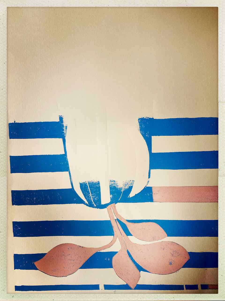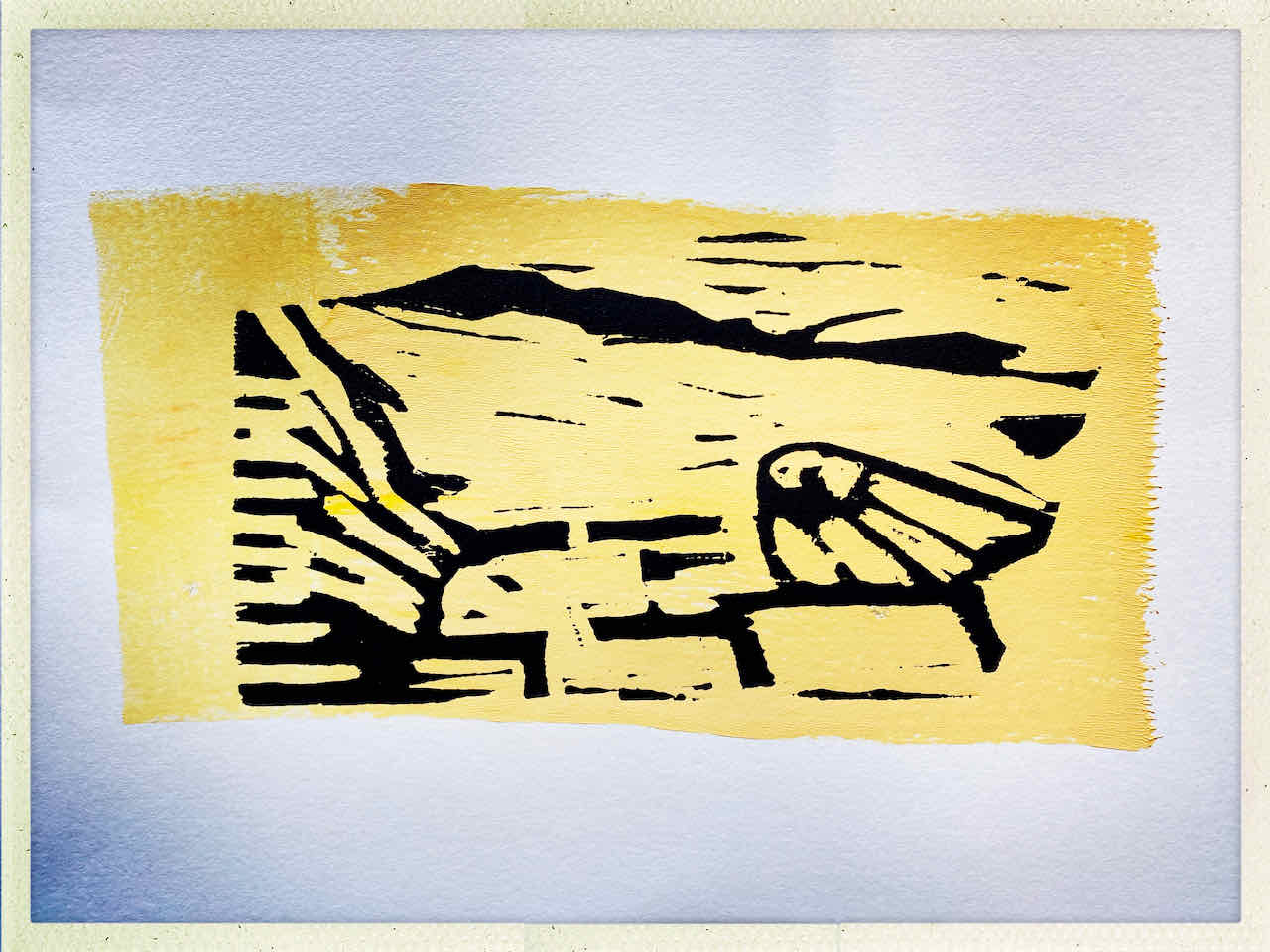 Obiges Bild ist Jürgens Beitrag für den 7. Dezember in Geldern: 7, OrtsMarke, Mas Miro, Montroig, SP, rainbird 293, Holzschnitt/woodcut, 2020