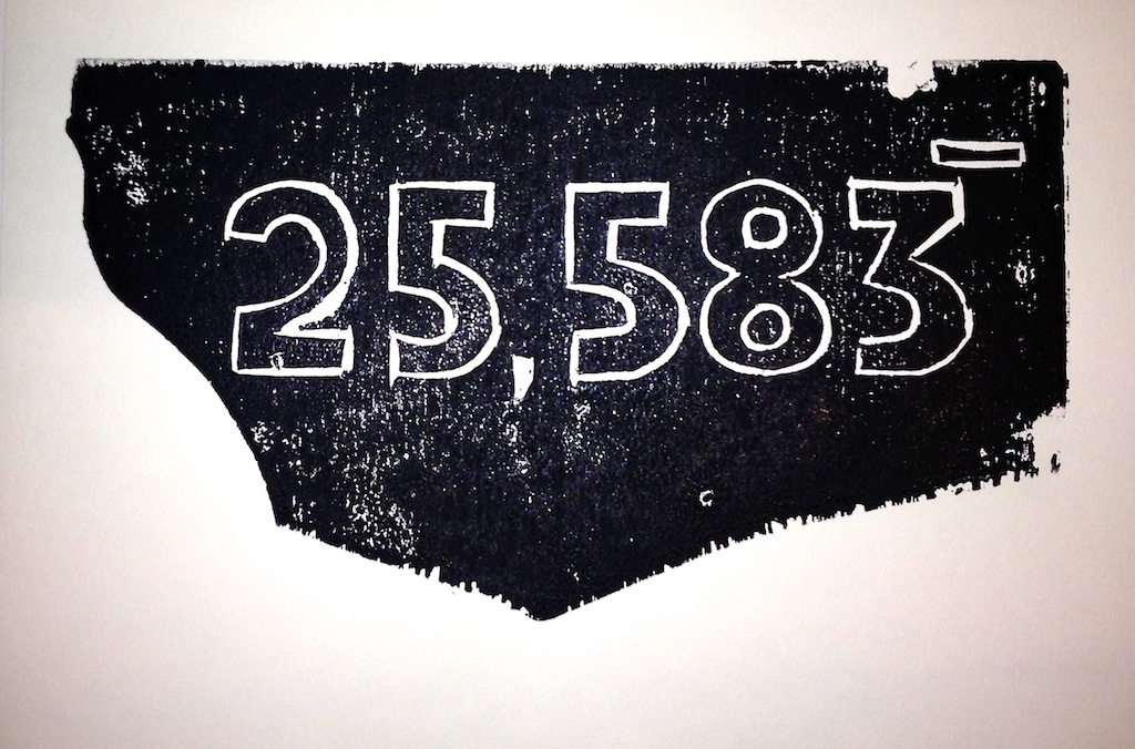 Nur eine Zahl und dennoch stecke dahinter immer mehr. Sagte Juergen über das Motiv seines Holzschnittes. Zahlen seien nur die Oberfläche, die geistige Markierung. Und wenn man nachbohre, verberge sich dahinter ein Teil des Lebens. Irgendwie. Zahlen suchten ja immer den Bezug zum Menschen. Oder umgekehrt. Meinte er.