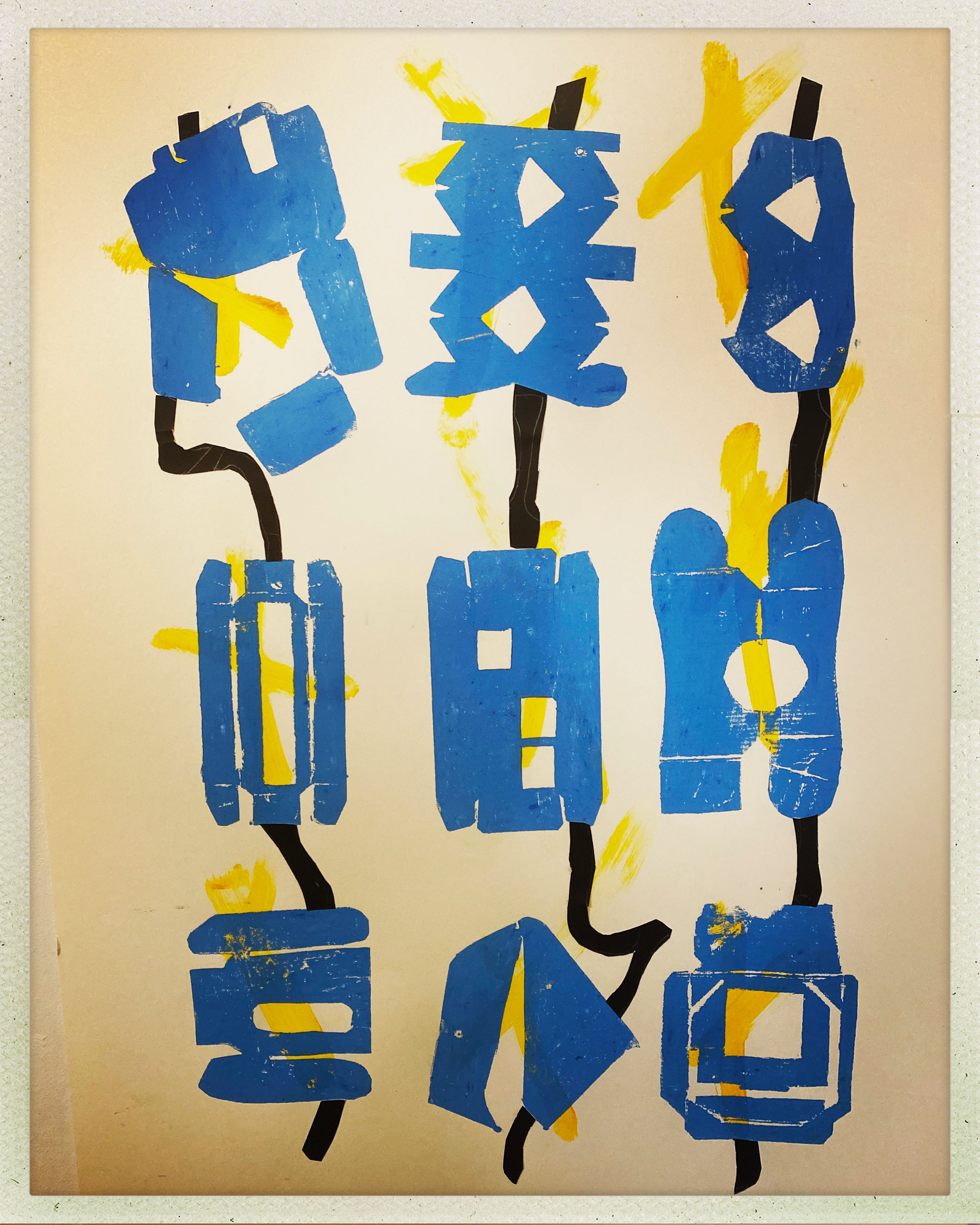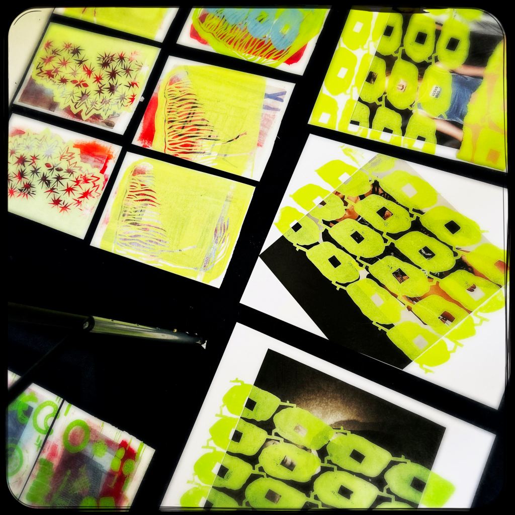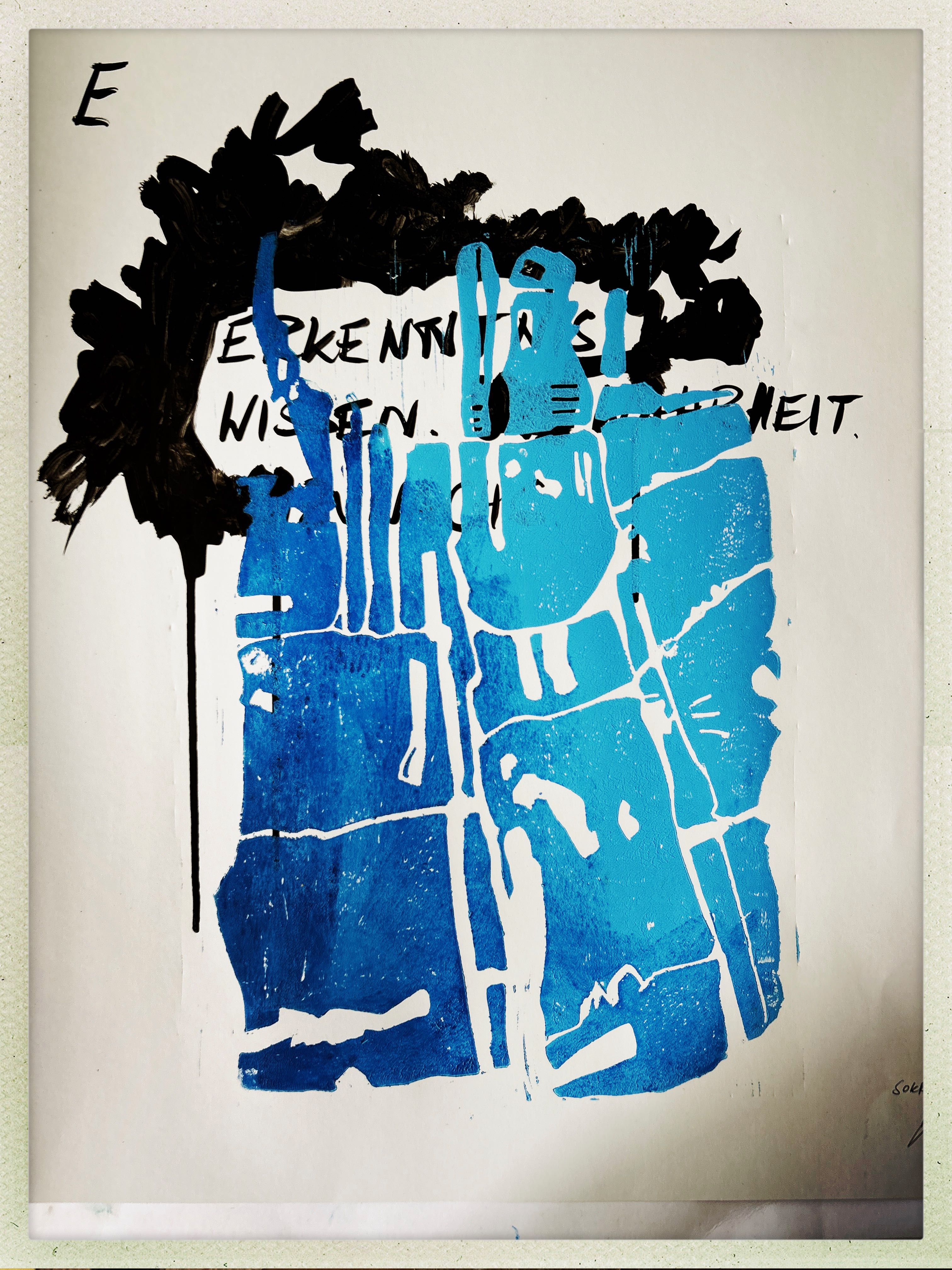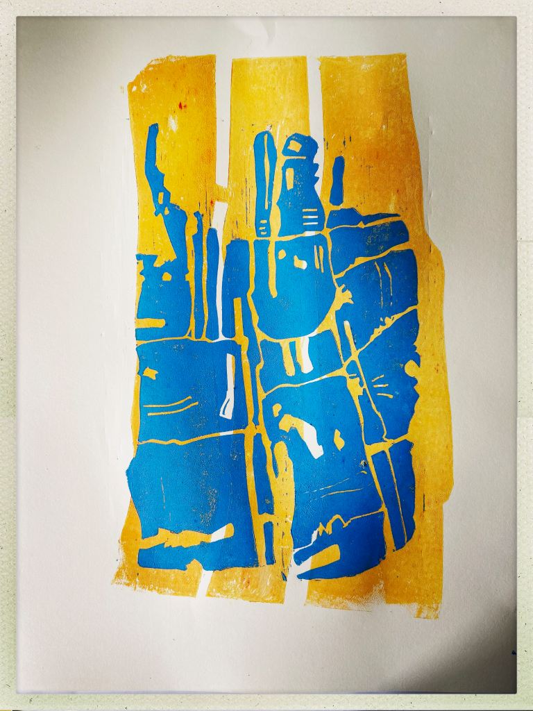 Jürgen hat seine zentralen Linolschnitt mit vielerlei Hintergründen kombiniert. Wie zufrieden er mit seinen thematischen Ergebnissen ist, sieht man daran, dass nächste Woche wohl nachgearbeitet wird.