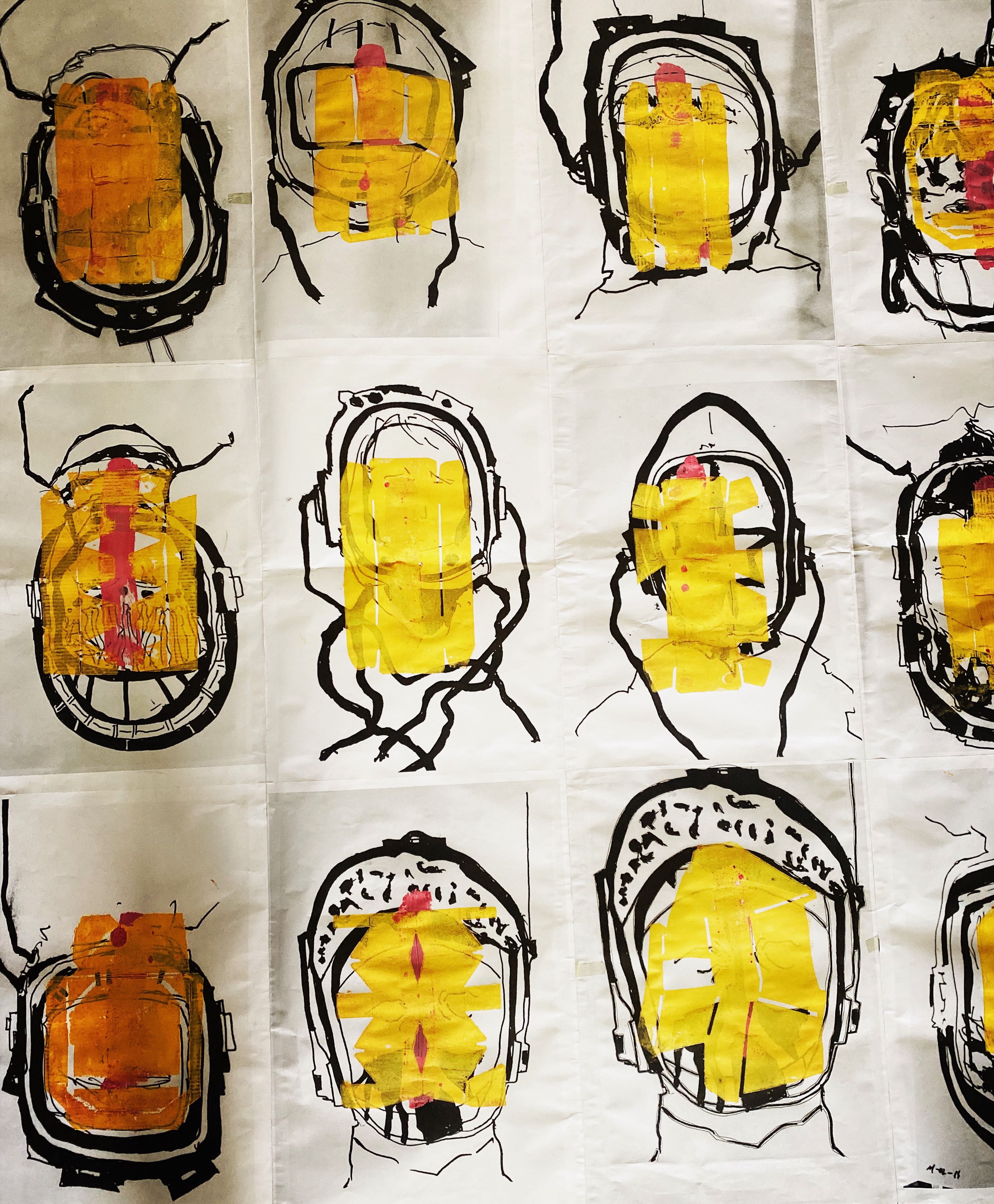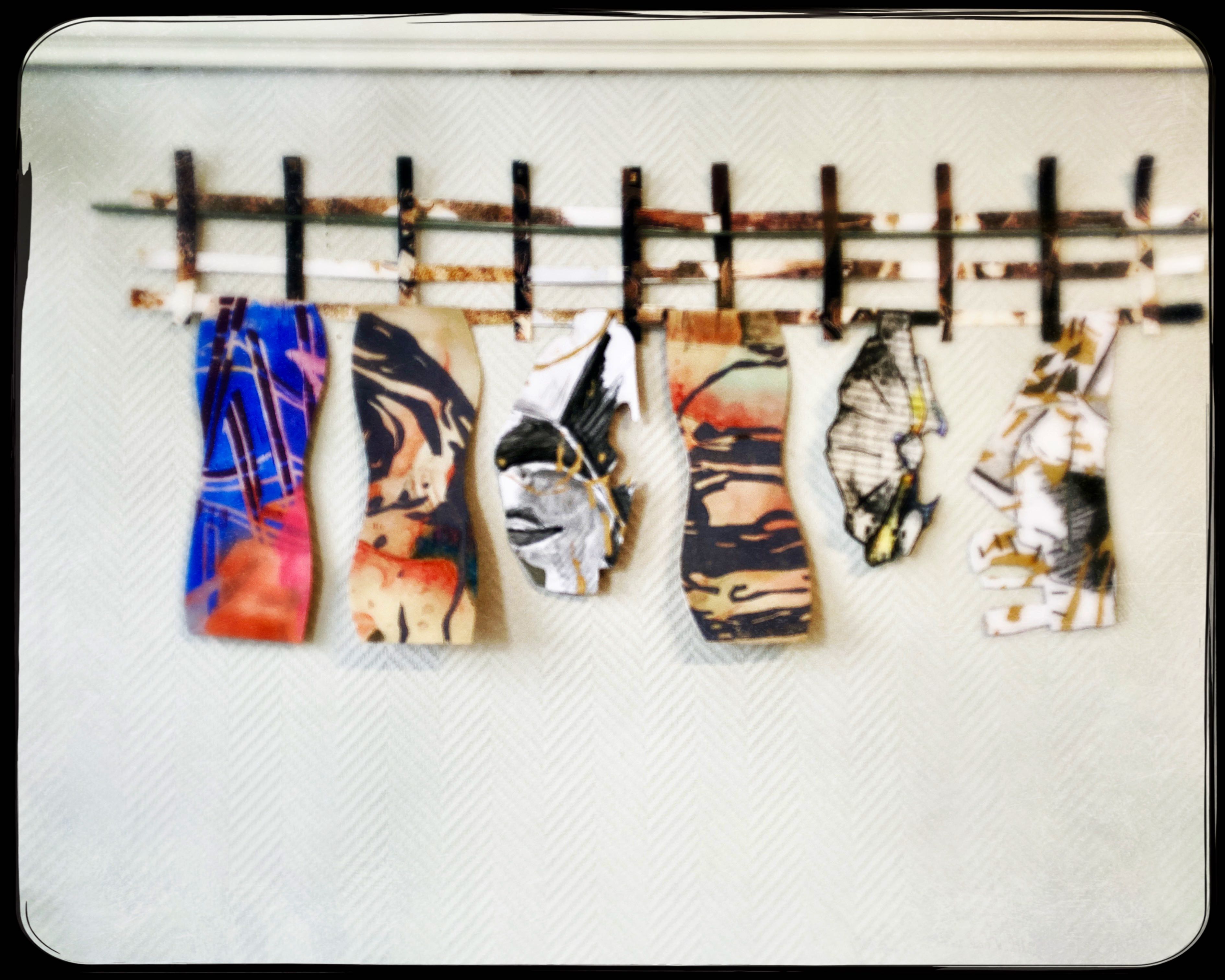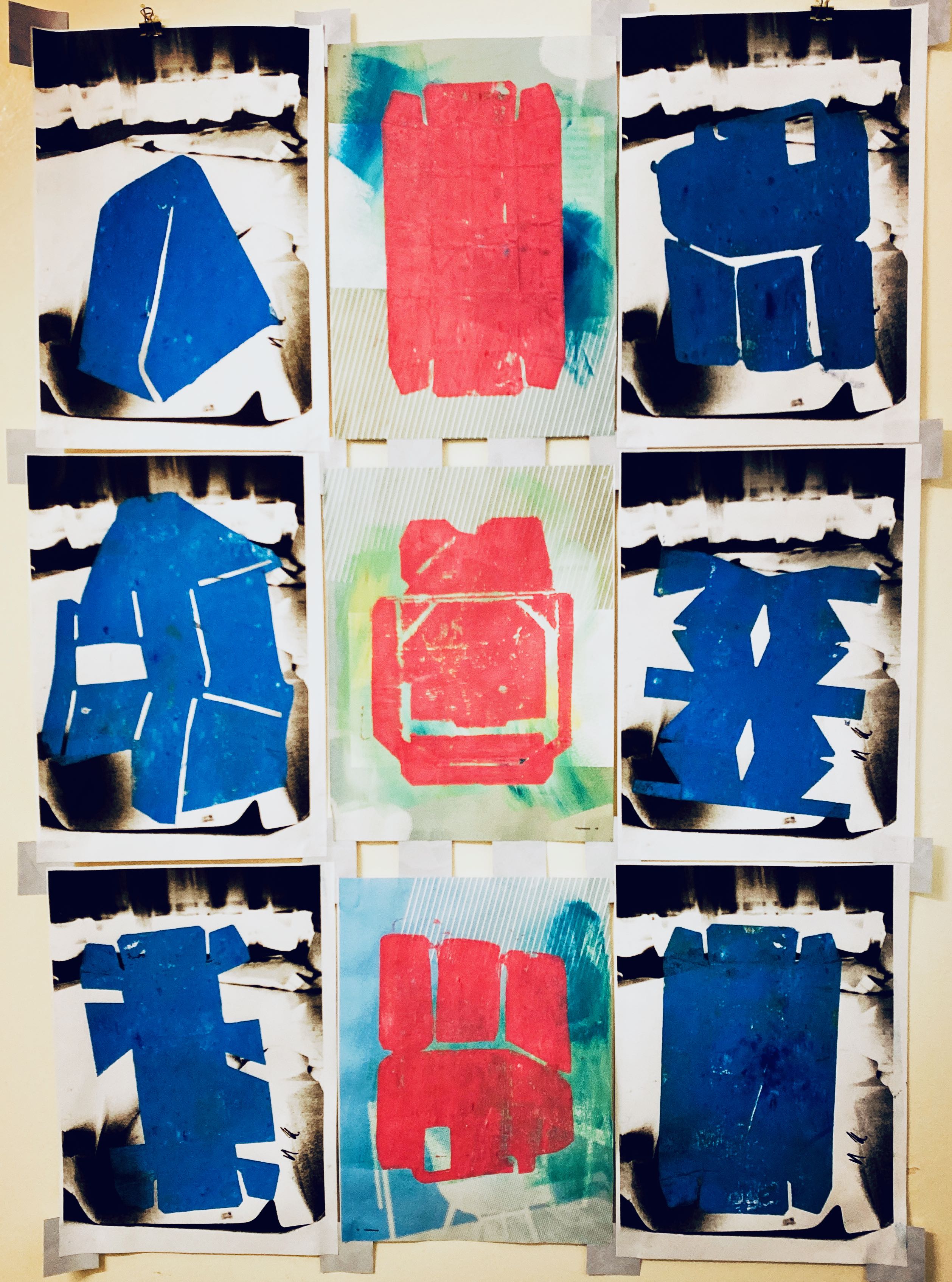 Jürgen hat seine zentralen Linolschnitt mit vielerlei Hintergründen kombiniert. Wie zufrieden er mit seinen thematischen Ergebnissen ist, sieht man daran, dass nächste Woche wohl nachgearbeitet wird.