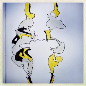 Rita hat irgendwann einmal in einem Kommentar zu „der Schatten ist der Zwilling“ gefragt, ob Jürgen der Schatten von Buchalov sei. Oder umgekehrt. Ein toller Gedanke, der uns Beiden bisher noch gar nicht gekommen war. Damit war der Schritt getan in Richtung Zwilling oder Verdoppelung von Köpfen. Ein paar „Versuche“ hat Jürgen schon mal in seinem Skizzenbuch verewigt. Es ist ja bei ihm oft so, dass er erst im Zeichnen selbst die Richtung entwickelt, in die es gehen soll. Oder dass sich der Sinn dessen, was er da tut, erst im Tun selbst erschließt bzw. entwickelt. In dieser Phase ist er jetzt.